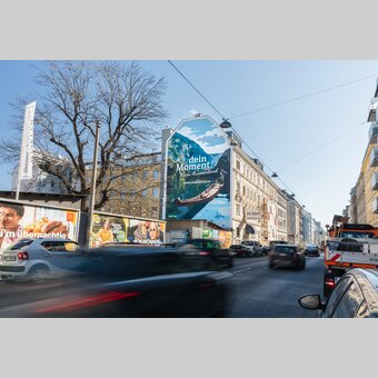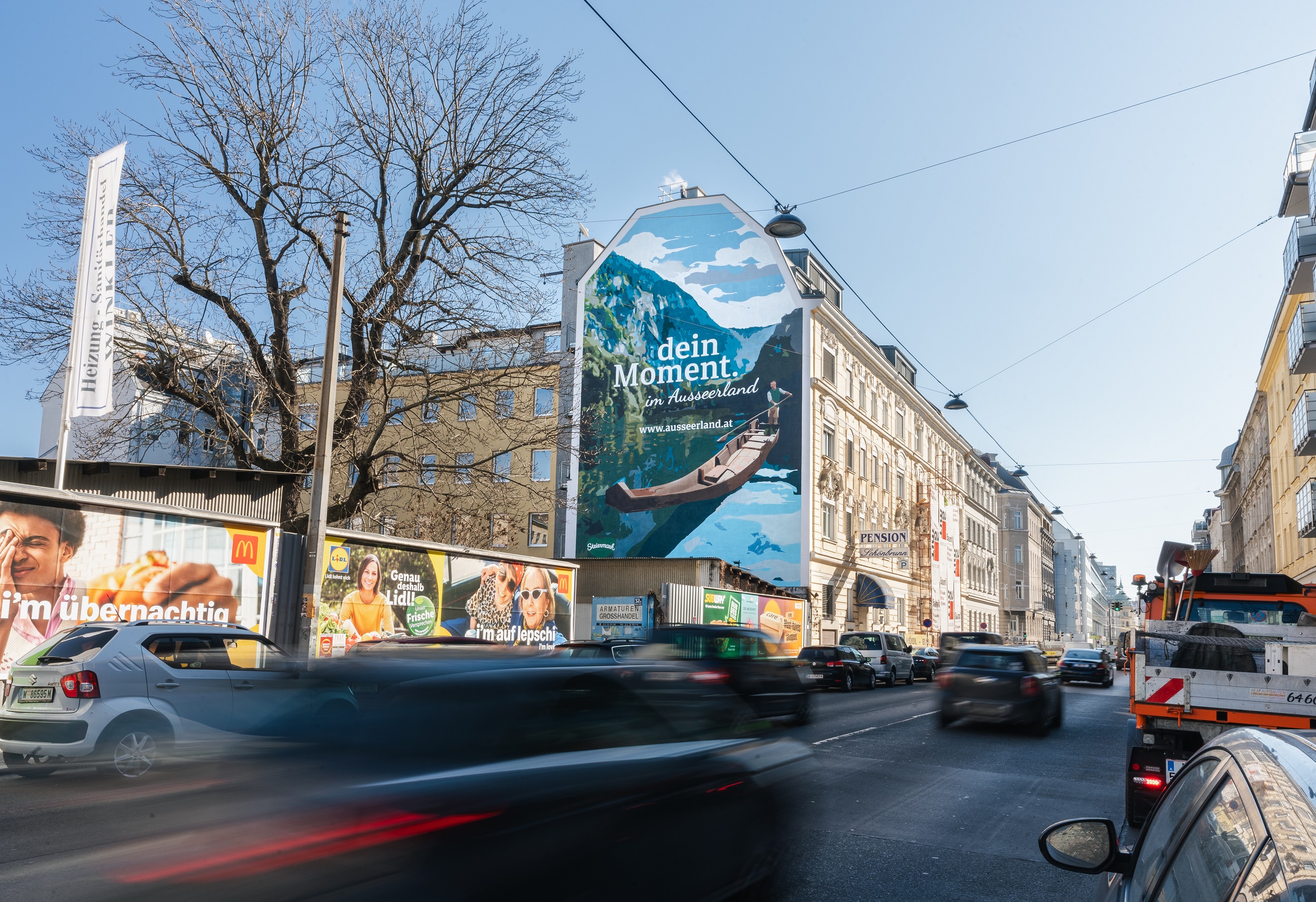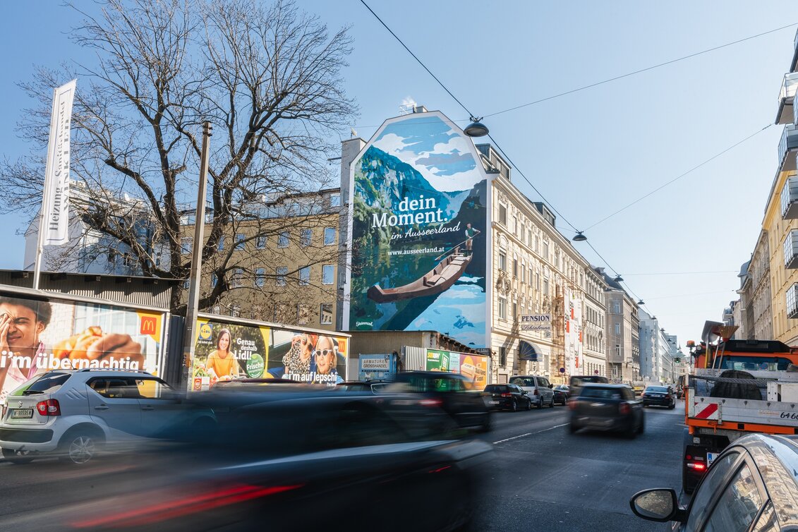 Fährt man unter anderem vom Wienerberg in Richtung Innenstadt, hinterlässt das Ausseerland riesengroßen Eindruck: Ein Bild vom Toplitzsee in Grundlsee mit einer Plätte ziert nun eine komplette Hausfassade in der Schönbrunner Schlossstraße in Wien – noch den gesamten März.
