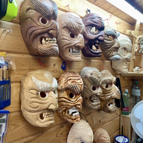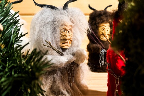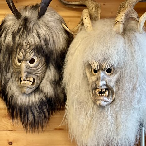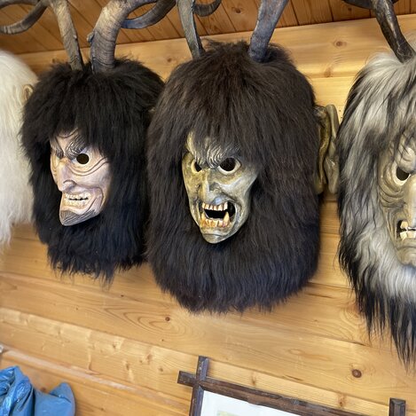 Einer davon ist Armin Hochrainer, 13 Jahre alt und bekennender Krampus-Fan. Mit sieben Jahren hat er sich zum ersten Mal eine Kindermaske beim Gasthof Thomahof – der bereits seit Jahrzehnten an der Organisation der Tauplitzer Nikolospiele mitwirkt – ausgeborgt und hat bei den Kinder-Nikolospielen mitgemacht. „Mit acht Jahren habe ich mir meine eigene Maske geschnitzt – mit zwei Messern auf den Fliesen in unserem Haus“, erzählt Armin lachend. Mittlerweile hat der Tauplitzer bereits acht fertige Krampusköpfe und unzählige Kindermasken geschnitzt. Traditionell werden im Thomahof die Masken und Kostüme für die Nikolospiel gelagert, die während des Jahres auch ausgestellt werden. Armin erzählt, dass er bereits einige Masken und sogar drei Köpfe für das Gasthaus geschnitzt habe, die sich mitwirkende Kinder für das Nikolospiel dort ausborgen können.