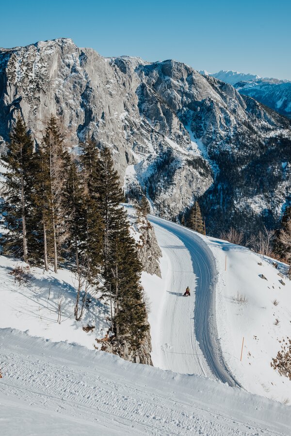 Schon viel länger ist der Loser für seine Rodeltouren entlang der Panoramastraße bekannt. Mit der Panoramabahn gibt es nun die Möglichkeit, die Rodeln bequem auf 1.600 Meter Seehöhe zu transportieren. Oben angekommen, reicht ein kurzer Fußweg und schon kann man auf der gemütlich fallenden Panoramastraße den Berg hinunterkurven. Unter dem mächtigen Panorama von Trisselwand und Dachstein führt die als Piste bestens präparierte Straße bis ins Tal. Damit wird die längste Familienabfahrt der Steiermark auch zu einer der längsten Rodelbahnen des Landes. Dass man sich diese mit Skifahrern, Snowboardern und Tourengehern teilt, trübt das Vergnügen keineswegs, denn am Erlebnisberg Loser finden alle Sportfreunde ihr persönliches Wintervergnügen.