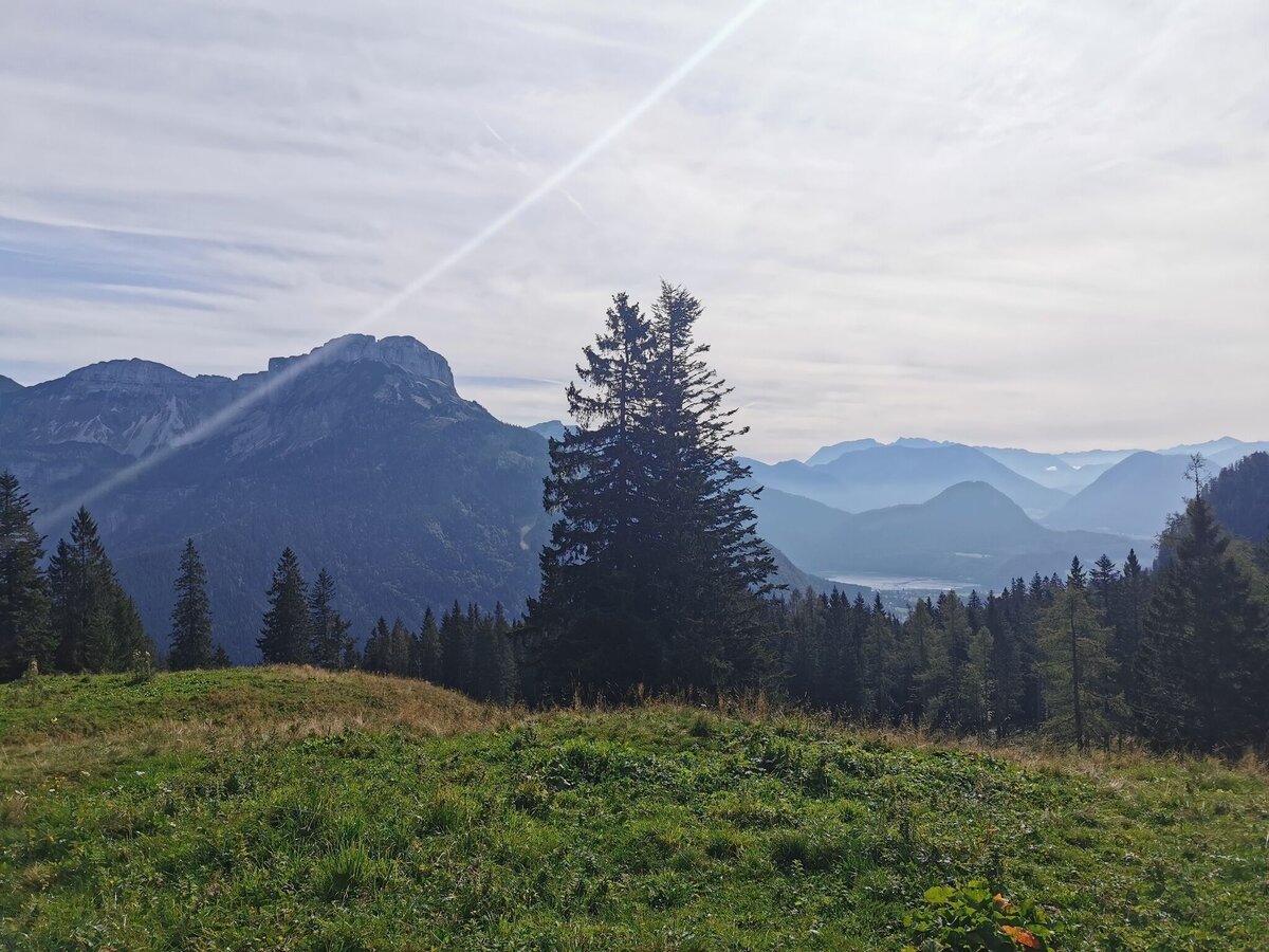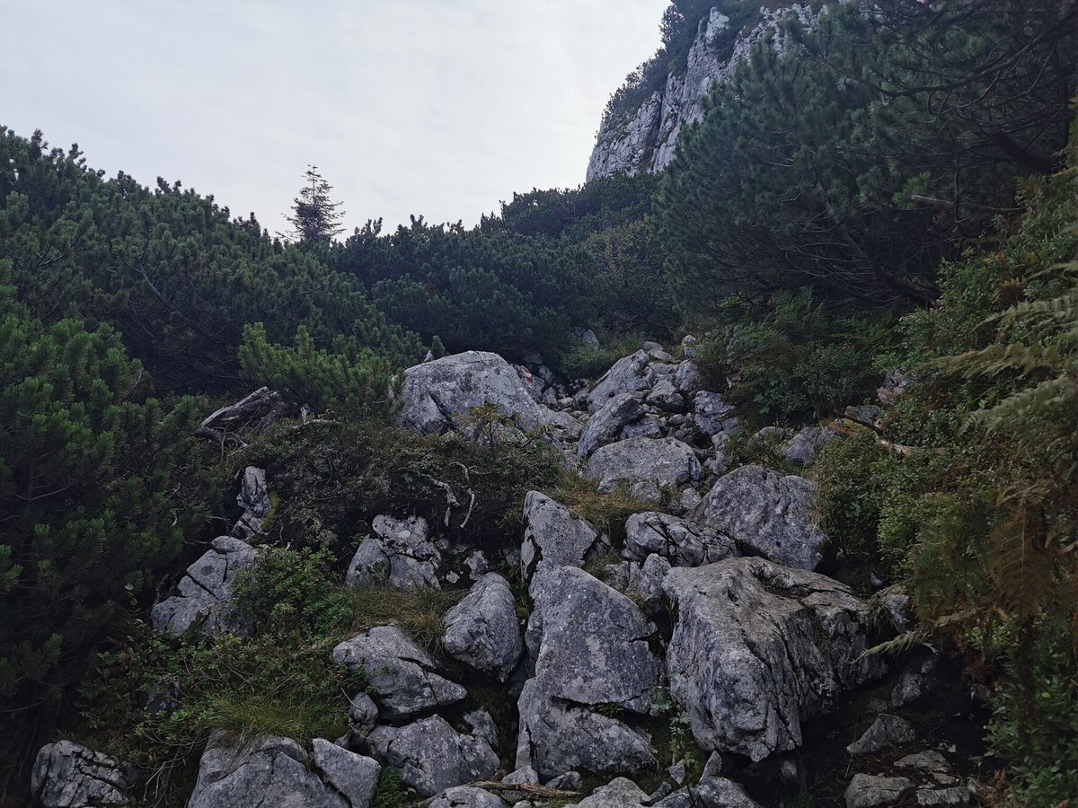 Unterhalb des Parkplatzes überquert man auf einem Durchlass einen Bach und wandert am Südrand der Blaa Alm entlang bis der Weg in den Wald hinauf führt, dann leicht ansteigend zur Fludergrabenalm. An der dortigen großen Wegkreuzung hält man sich links und steigt den markierten Weg (Nordalpenweg, Via Alpina) hinauf zur Sandlingalm, den man nach etwa einer Stunde Aufstieg erreicht.