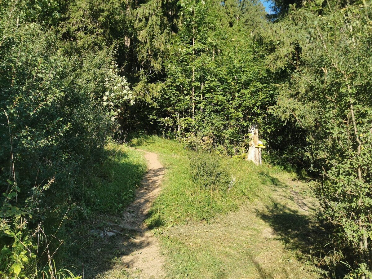 Gegenüber der Kirche führt ein schmaler Weg zwischen dem NKD-Geschäft und der Bäckerei Reisinger in Richtung Norden. Nach etwa 250 Metern zweigt rechts eine Straße ab, die am Alpenbad vorbei in den schattigen Wald führt. In der darauffolgenden Rechtskurve biegt links der Wanderweg zur Simonywarte ab.