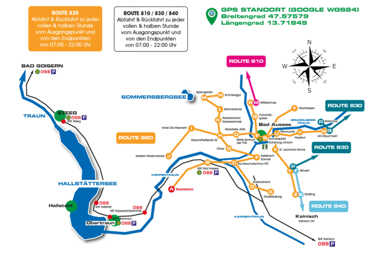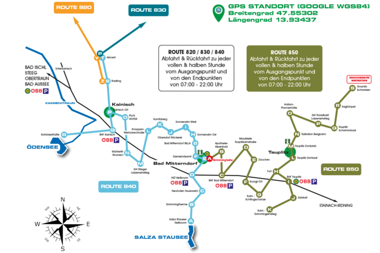Auf fünf Routen zwischen Sandling und Grimming verkehrt das Salzkammergut-Shuttle-Service täglich von 07:00 bis 22:00 Uhr von den Anschlussstellen wie Bahnhöfe, Bushaltestellen, Ortsstellen und Parkplätze zu den 110 Zielen, um Bewohnern und Gästen ein elegantes Weiterkommen auch ohne eigenes Auto zu ermöglichen.