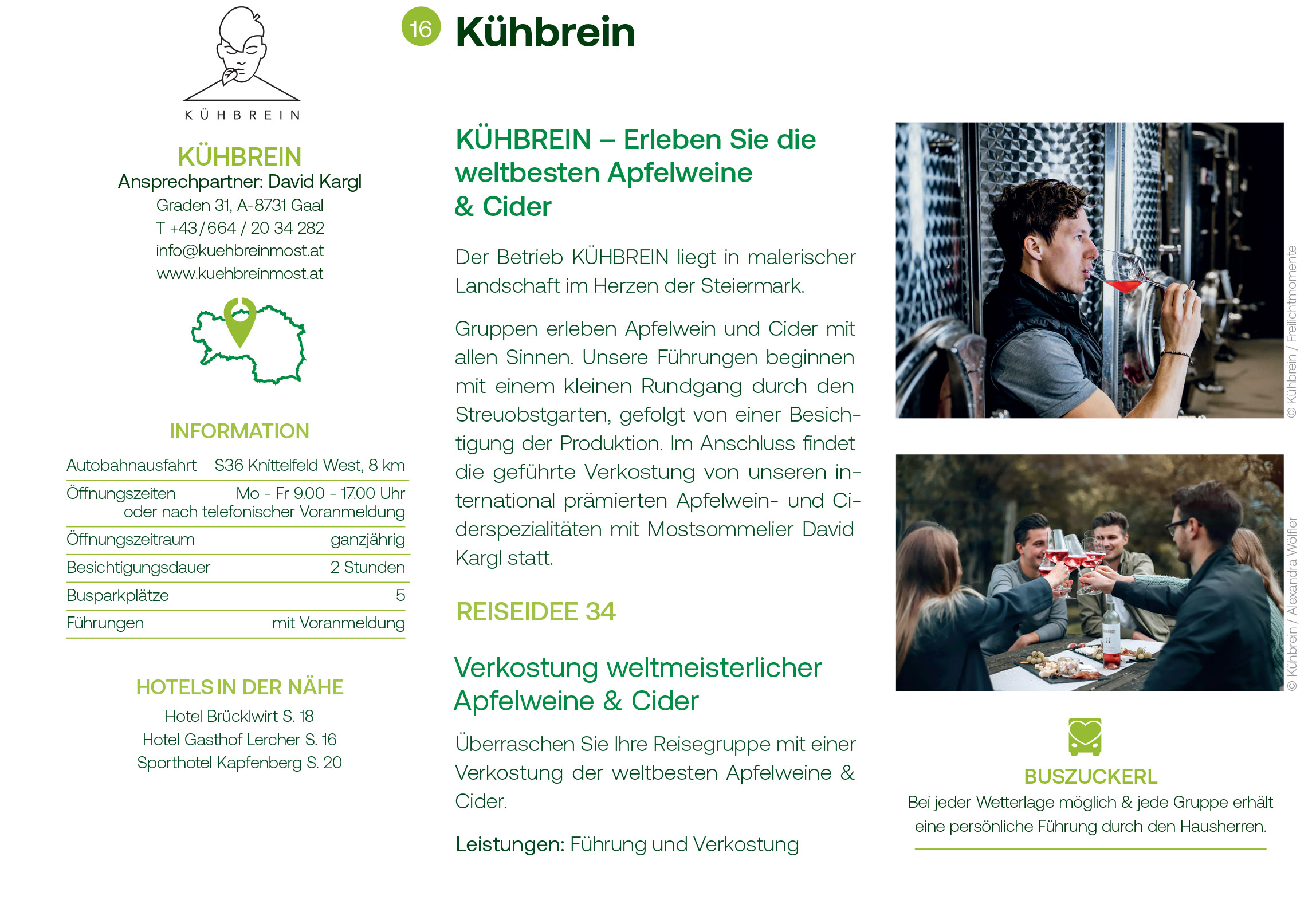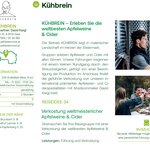 Der Betrieb KÜHBREIN liegt in malerischer Landschaft im Herzen der Steiermark. Gruppen erleben Apfelwein und Cider mit allen Sinnen. Unsere Führungen beginnen mit einem kleinen Rundgang durch den Streuobstgarten, gefolgt von einer Besichtigung der Produktion. Im Anschluss findet die geführte Verkostung von unseren international prämierten Apfelwein- und Ciderspezialitäten mit Mostsommelier David Kargl statt.