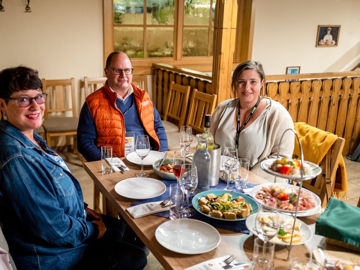 Zum Abendessen gesellten sich Günter Stocker von der Erlebniswelt Stocker in Rohrmoos und Angelika Dietmayer von der Erlebnisregion Schladming-Dachstein dazu. Fr. Dietmayer präsentierte ein besonderes "Zuckerl" der Region: die Schladming-Dachstein Sommercard, die jährlich von Mitte Mai bis Ende Oktober attraktive Vergünstigungen für nächtigende Gäste ermöglicht. Besonders groß war die Freude über den Sieg des nahegelegenen Friedenskircherls am Stoderzinken bei der ORF TV-Show "9 Plätze - 9 Schätze". Das Kircherl war am Vorabend zum schönsten Platz Österreichs gekürt worden.