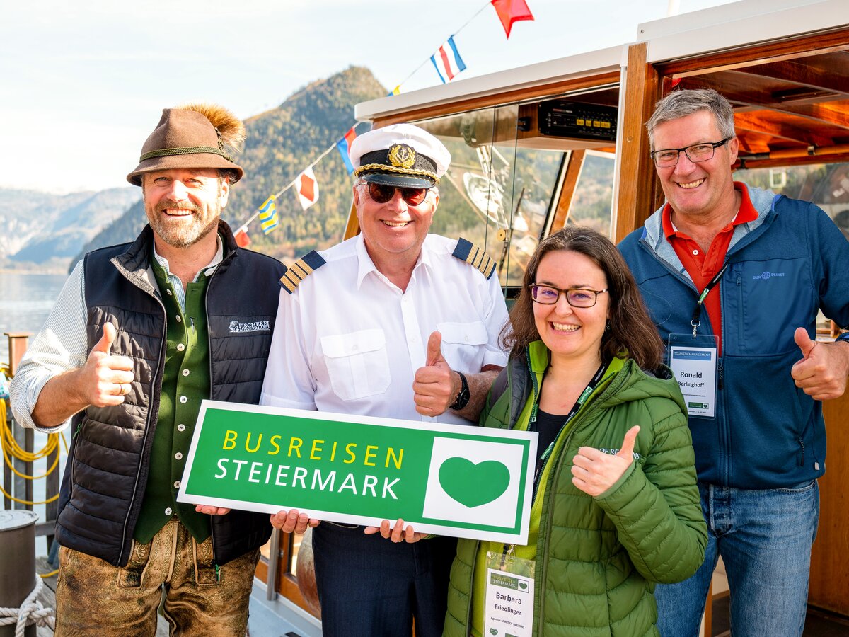 Jede Reise in die Steiermark ist auch immer eine Genussreise. So auch auf dem Loser, wo in der Loser-Hütte kulinarisch aufgetischt wurde. Das Wetter bescherte uns beste Fernsicht auf die umliegende Bergwelt und den Dachsteingletscher. Hier ließe es sich ganz wunderbar den ganzen Tag verweilen. Doch auf einer Studienreise gilt es viel Wissen zu sammeln. Besonders spannend beim nächsten Programmpunkt: die Kombination von Nostalgie-Schifffahrt am „Steirischen Meer“ mit einer Verkostung der Ausseer Fischereiprodukte. Kapitän Herbert und Fischexperte Christian verwöhnten uns mit einer erstklassigen Fischermahlzeit vor eindrucksvoller Kulisse.