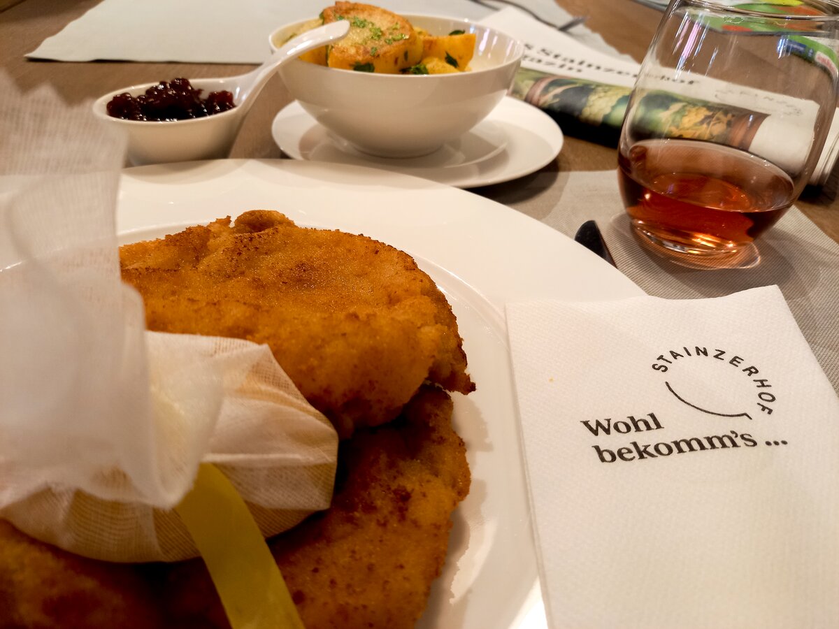 Von Schloss Stainz spazieren wir über den Erzherzog Johann Weg zur Jakob-Rosolenz-Stiege, sie führt vorbei an zwei Barocktürmen direkt hinunter zum Stainzerhof. Das Hotel im Ortskern ist idealer Ausgangspunkt für Erkundungstouren durch die Region. Wir beziehen unsere Zimmer und machen uns auf zum Mittagessen. Ganz klassisch gönnen wir uns ein Kalbswiener mit Erdäpferl und Preiselbeeren.