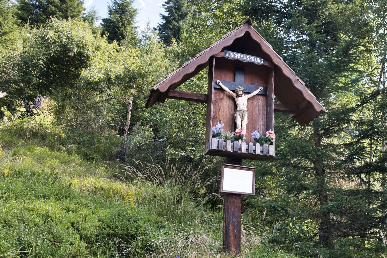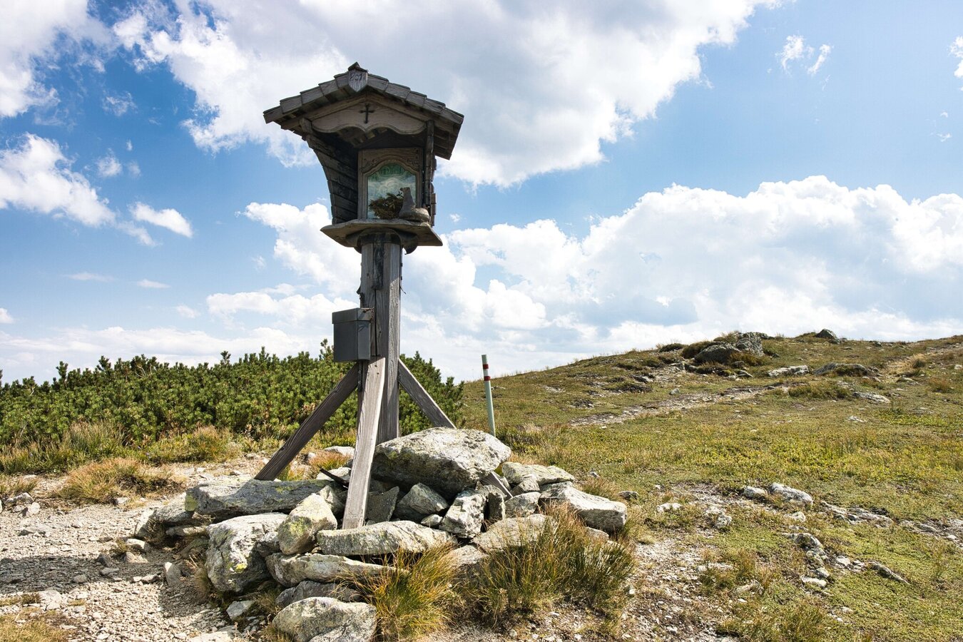 Wir starten beim Bahnhof Wald am Schoberpass (841 m) und gehen zunächst ins Ortszentrum. An der Wanderübersichtstafel „Styrian Iron Trail“ vorbei folgen wir der Straße leicht bergauf, biegen links in Richtung „Naturfreundehaus St. Michael“ ab und gehen gemütlich bergauf bis die Asphaltstraße endet. Der weitere Weg verläuft zu Beginn auf einer Forststraße, wobei auf die Holzwegweiser in Richtung Leobner zu achten ist. Über mehrere Forststraßenabschnitte, teils leicht bergab, gelangen wir zu der ersten Hinweistafel „Aigelsbrunner Alm“. Über Forstwege und Steige wandern wir durch einen schattigen Graben, erreichen die Zufahrtsstraße zur Alm, passieren das Wegkreuz Jungfrausprung und kommen schließlich zur Aigelsbrunner Alm mit Halterhütte (1.526 m) und Jagdhaus. Von hier halten wir uns leicht links bergauf; die Wegführung ist stellenweise schwer zu erkennen. Ab dem Leobner Törl wird die Orientierung wieder einfacher. Wir gehen rechts weiter, passieren die Quelle „Heiliger Brunnen“ und sehen nach einem kurzen, steileren Anstieg die Lahnerleitenspitze (2.027 m). Ein kurzer – aber lohnenswerter – Abstecher führt uns zum Gipfel. Im weiteren Verlauf führt der Steig im ständigen Auf und Ab über den Speikkogel (1.992 m) und das Hinkareck (1.932 m) bis zum Kreuzungspunkt Antonikreuz. Wenige Meter vor diesem Sattel biegen wir in spitzem Winkel rechts ab und folgen dem Steig bergab. Bald erreichen wir den Wald und wandern den Markierungen folgend über die verfallene Brunnebenalm (1510 m) zurück nach Wald am Schoberpaß.