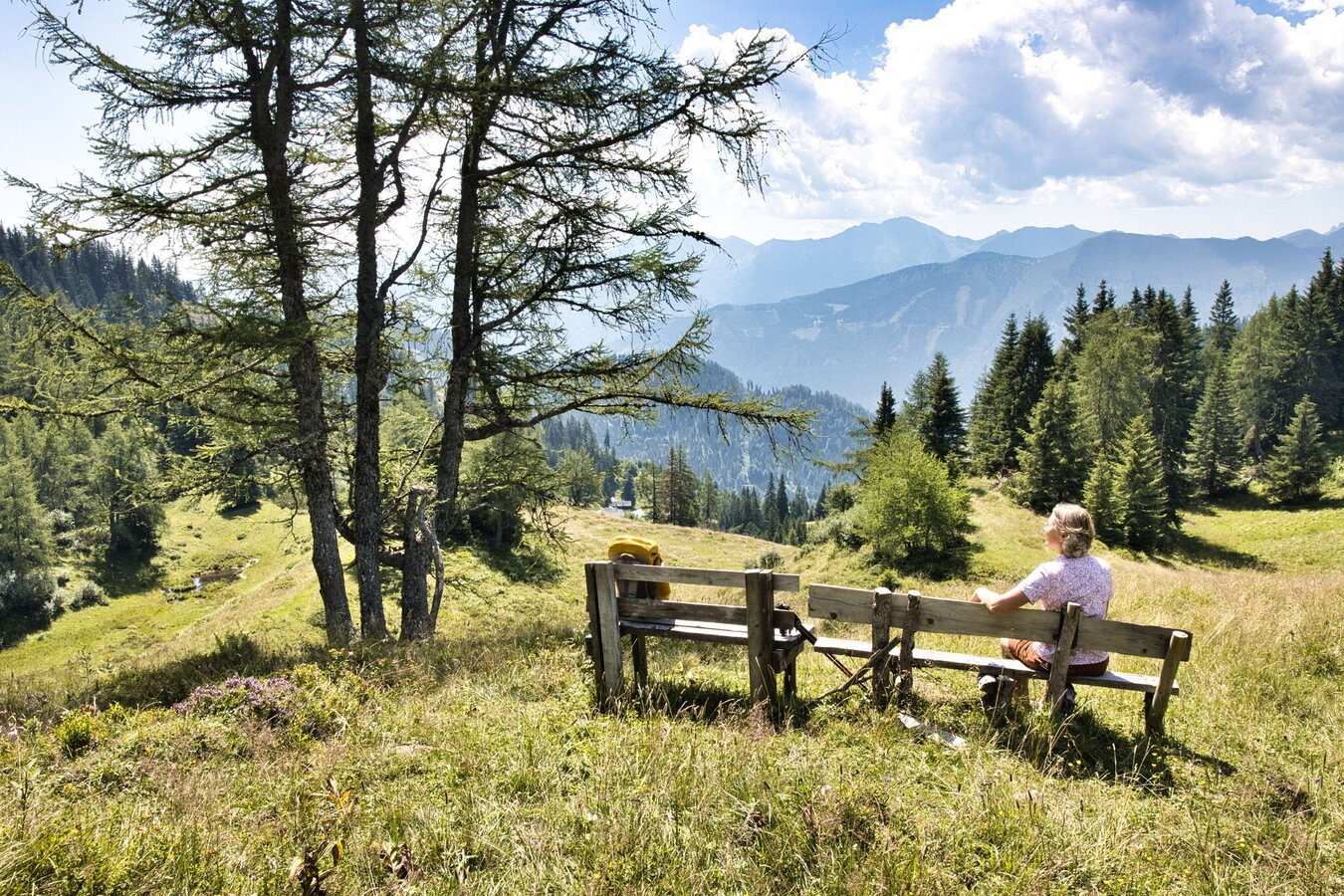Wer es kürzer mag, wandert bis zur Aigelsbrunner Alm. Dort genießt man den Ausblick und erhält von Roswitha bei herzlicher Bewirtung Einblicke ins Almleben. (Wanderdaten: 15,4 km, 800 Hm, 5 h)
