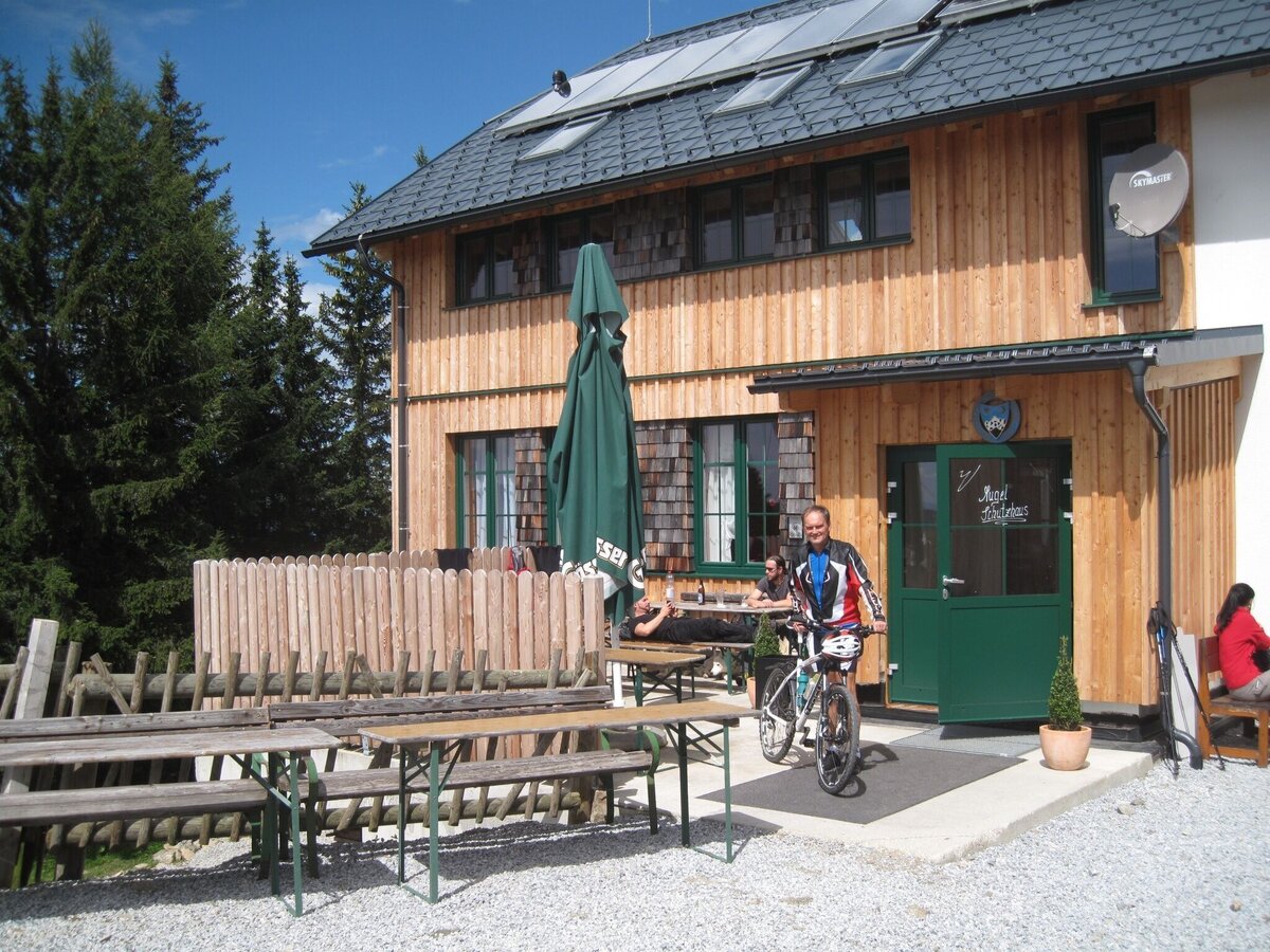 Wir folgen vom Asia Spa aus dem R2 bis Niklasdorf, während der R2 vor dem Billa-Markt nach links abbiegt, bleiben wir noch ein paar hundert Meter auf der Bundesstrasse und verlassen diese beim "Eine Welt Laden" auf der linken Seite und überqueren die Eisenbahnbrücke. Dann geht es rechts weiter bis zum Gasthaus Eckkaffee, dort links in den bergwärts führenden Graben. Nach ca. 1 km geht die Asphaltstraße in eine Schotterstraße über und wir gelangen zum Winter-Mugelparkplatz. Von dort geht es rechts steil bergauf zum zweiten Parkplatz, den wir nur im Sommer mit dem Auto erreichen können. Nun geht´s an einem Schranken vorbei ( Vorsicht bei der Abfahrt !! ), weiter sehr direkt und steil bergauf bis wir nach einer kurzen Rechtsschleife auf die Mugelwiese rauskommen. Weiter über den Ochsenstall (gute Jausenstation), immer der Forststraße folgend auf den Mugelsender (1.400m ). Hier kann man die Aussicht auf das Murtal in vollen Zügen genießen. Von hier aus geht es, kaum mehr fahrbar, über einen sehr steilen und losen Schotterweg in Richtung Mugelschutzhaus. Alle, die es bis hierher geschafft haben, müssen nun auch beim Schranken im Wald absteigen, und die restlichen Meter bis zum Schutzhaus schieben.