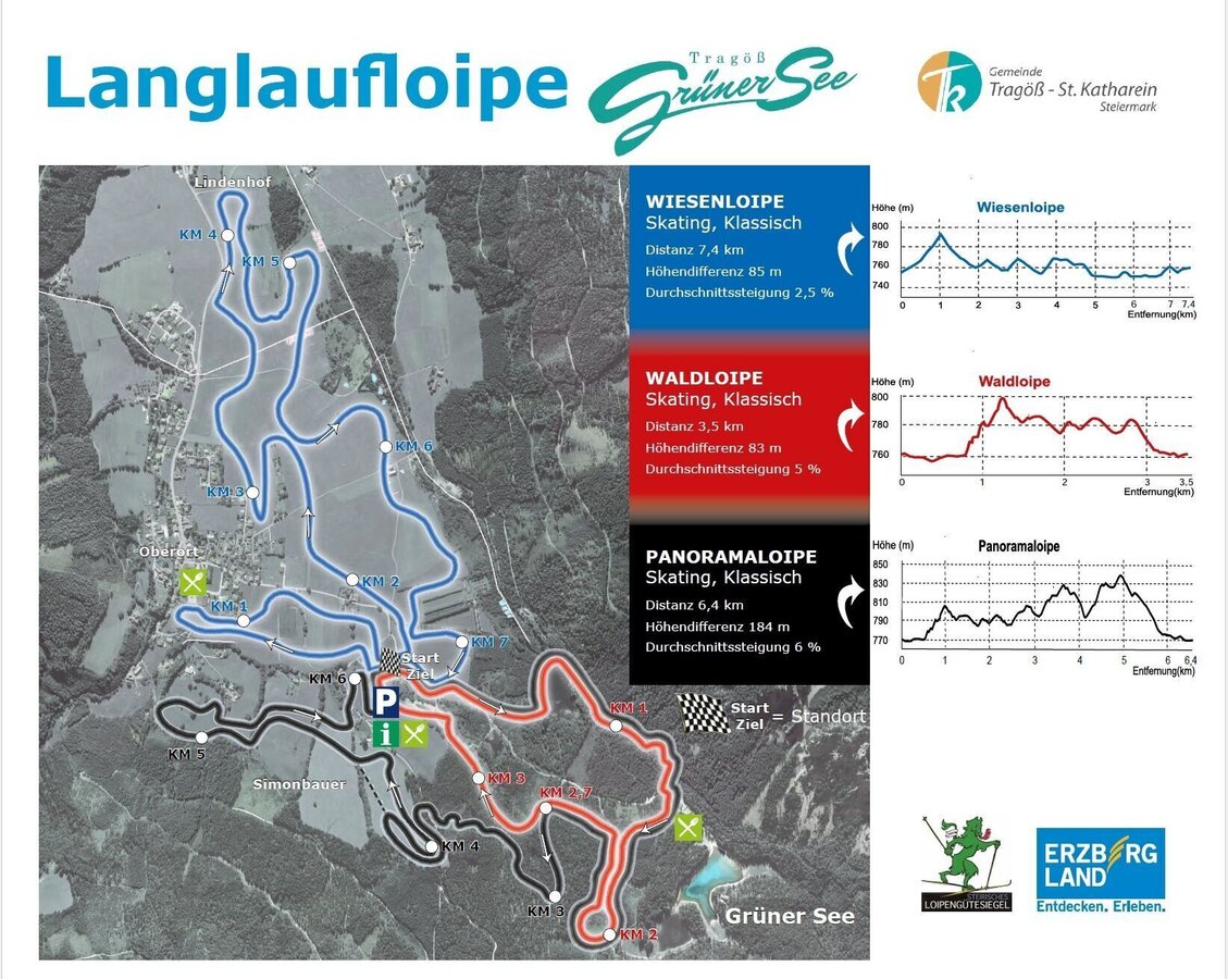 Neben dem beeindruckenden Naturerlebnis überzeugt die Loipe Tragöß - Grüner See mit perfekt gespurten 15 Loipenkilometern in drei verschiedenen Schwierigkeitsstufen. Diese sind miteinander verbunden, und bieten die Möglichkeit, entweder nur die bevorzugte Strecke (Wiese, Wald oder Panorama) oder alle ca. 15 km in einer durchgehenden Runde zu laufen.