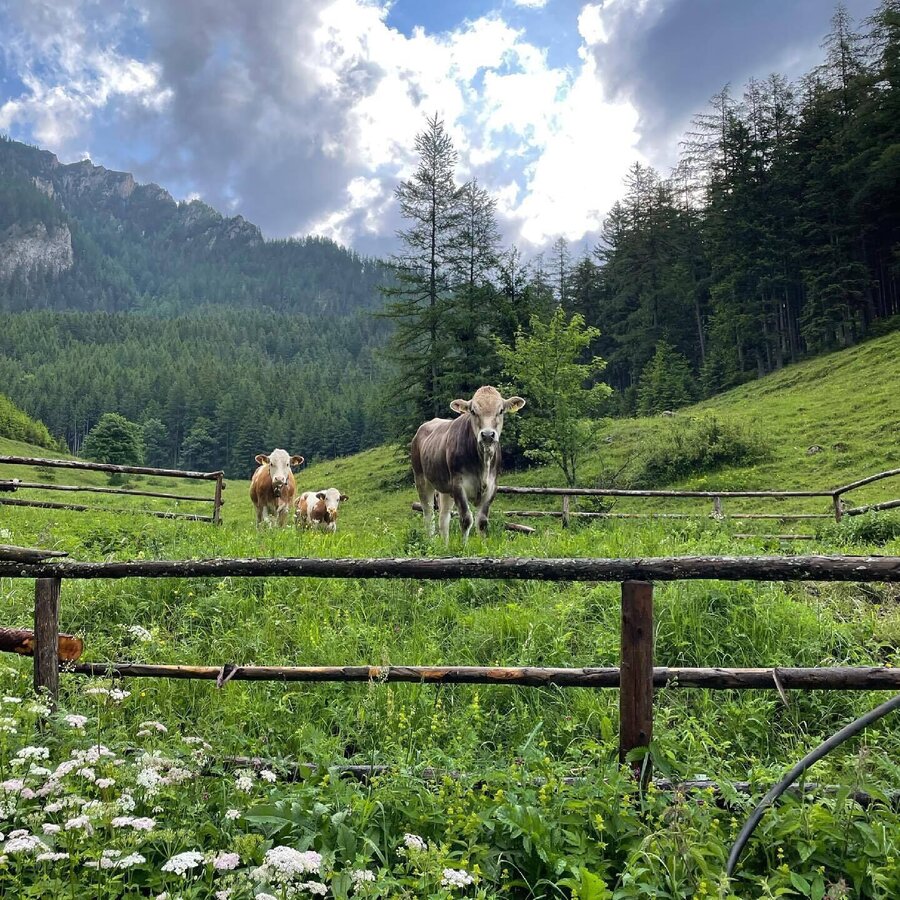 Dazu muss die B115 überquert werden. Auf einer sanft ansteigenden Nebenstraße genießen wir ein herrliches Panorama mit dem Reiting und den Bergen der Eisenerzer Alpen als Blickfang. Nach Erreichen des höchsten Punktes geht es durch ein Siedlungsgebiet hinab nach St. Peter Freienstein. Hier treffen wir auf den R38, dem wir – bis zum Ausgangspunkt unserer Tour folgen.