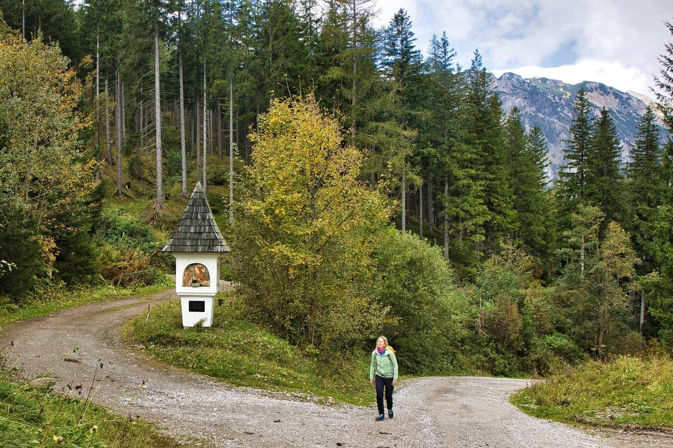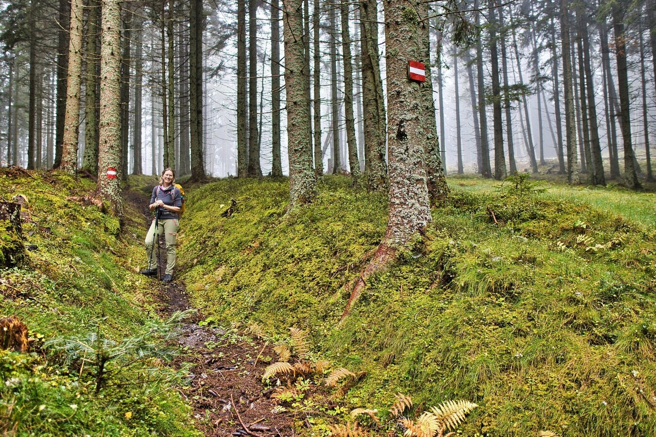 Wir starten in Vordernberg (839 m) und sehen in der Nähe des Radwerks IV den Wegweiser in Richtung Hiaslegg. Der Rötzstraße folgend gehen wir unter der Bahnbrücke hindurch und verlassen bereits nach wenigen Metern das besiedelte Gebiet. Der Pilger- bzw. Wanderweg führt entlang einer Schotterstraße - teilweise sehr steil - bergauf. Kurz nach der ersten Lichtung (vlg. Brandstetter) erreichen wir den Übergang Hohe Rötz (1064 m). Wir folgen der Straße bergab und gehen in der Rechtskurve geradeaus auf dem breiten Geh- und Mountainbikeweg weiter, der bergab in den Rötzgraben führt. Die nächsten 4,3 Kilometer folgen wir der Straße bis zum Passübergang und dem Gasthaus Hiaslegg (1154 m). Wir gehen ein Stück der Straße in Richtung Tragöß entlang, bis wir links die Beschilderung sehen und den Wander- und Pilgerweg bergab nehmen. Am Talboden angekommen teilt sich der Weg in Richtung Grüner See oder geradeaus nach Tragöß Oberort. Vorbei am Heimatmuseum in Tragöß Oberort (793 m) geht es einen Kilometer den Haringgraben entlang, bis wir rechts abzweigen und der breiten Forststraße (Wanderweg 846) rund 2,5 Kilometer bergauf folgen. Über einen Steig erreichen wir das im Wald gelegene Riegnereck (1220 m), den höchsten Punkt der heutigen Etappe. Ein kurzes Stück geht es entlang des Steiges, bis wir die Forststraße erreichen und dieser kontinuierlich bergab durch den Oischinggraben folgen. Am breiten Talboden ankommen, pilgern wir auf der Schotter- und Asphaltstraße bis zum Ort Etmißl (709 m) und weiter nach Büchsengut. Beim Ungerwirt verlassen wir die Straße und biegen nach links in eine kleine Straße ein, die zum Fegenberg führt. Von hier geht es abwärts bei den Alpakas vorbei, danach in den Fölzgraben, wo es rechts nach der Hackschnitzelanlage über eine Schotterstraße bis nach Aflenz Kurort geht.