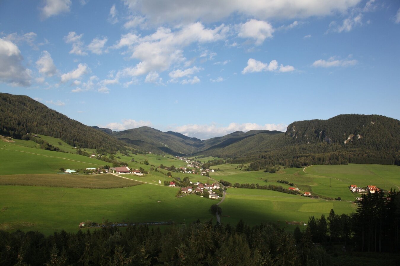 Von hier führt die Straße auf das Mellplateau mit tollem Ausblick auf die Stadt Trofaiach und das Reitingmassiv sowie Blick auf „Schlossbauer“ und Photovoltaikanlage. Durch den Bauernhof Köck (mit Streichelzoo) und die Zlatten gelangt man nach steiler Abfahrt über Schoberkreuz, Laintal und Wolkersdorf zurück nach Trofaiach.