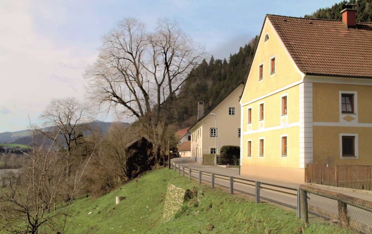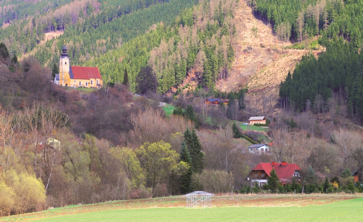 Die Fahrt geht weiter über eine kleine Rad-Brücke über die Mur und dann entlang eines Kanals in Richtung Murinsel und Murstadion. Hier stoßen wir wieder auf den Murradweg, auf dem wir bis zum Brucker Hauptplatz radeln. Nach einer kurzen Rast geht es wieder zurück nach Leoben. Schon nach wenigen hundert Metern biegt die Route rechts in die Bergstraße ab, von der wir bei einem Kreisverkehr links auf die Oberdorferstraße wechseln. Immer geradeaus kommen wir auf der Landskronstraße bald nach Oberdorf. Weiter geht es am linken Murufer (flussabwärts gesehen) auf dem Murradweg R2 nach St. Dionysen. Immer leicht ansteigend erreichen wir nach einigen Kilometern Köllach, gegenüber von Niklasdorf gelegen. Bei der Kreuzung biegen wir nicht links nach Niklasdorf ab, sondern fahren auf der Landesstraße geradeaus nach Proleb.
