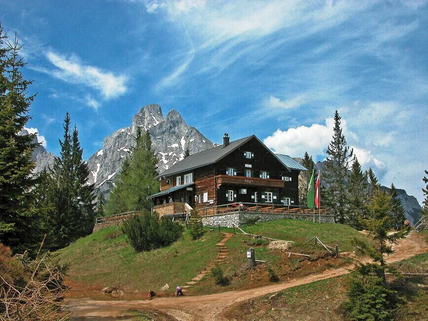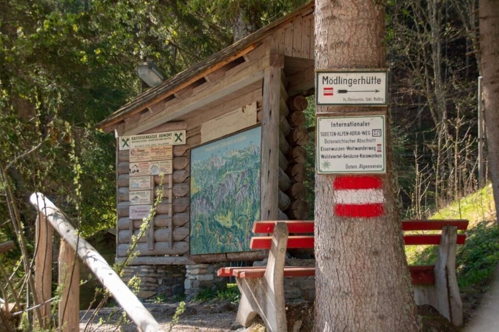 Ab dem GH Donner in Johnsbach wandern wir einen bequemen Steig, vorbei an einem kleinen Kraftwerk entlang des Baches, stetig bergauf durch den Wald. Einige Ruhebänke laden zum Genuss der herrlichen Aussicht mit Tiefbicken auf das Johnsbachtal ein. Schließlich erreichen wir nach ca. 1 1/2 stündiger Wanderung eine Forststraße, die uns die letzten Höhenmeter zur Mödlinger Hütte führt. Die Hütte ist bestens bewirtschaftet und je nach Tageszeit kehren wir zu einem Frühstück mit einem Heidelbeerstrudel oder zum Mittagessen mit einer Auswahl an Knödel-, Nockerl- oder auch Fleischgerichten ein. Auch eine Brotzeit mit Speck und Kas ist nicht zu verachten. Immer wieder finden auch Spezialitätenwochen wie z.B. eine Knödelwoche oder "steirische Hausmannskost" statt.