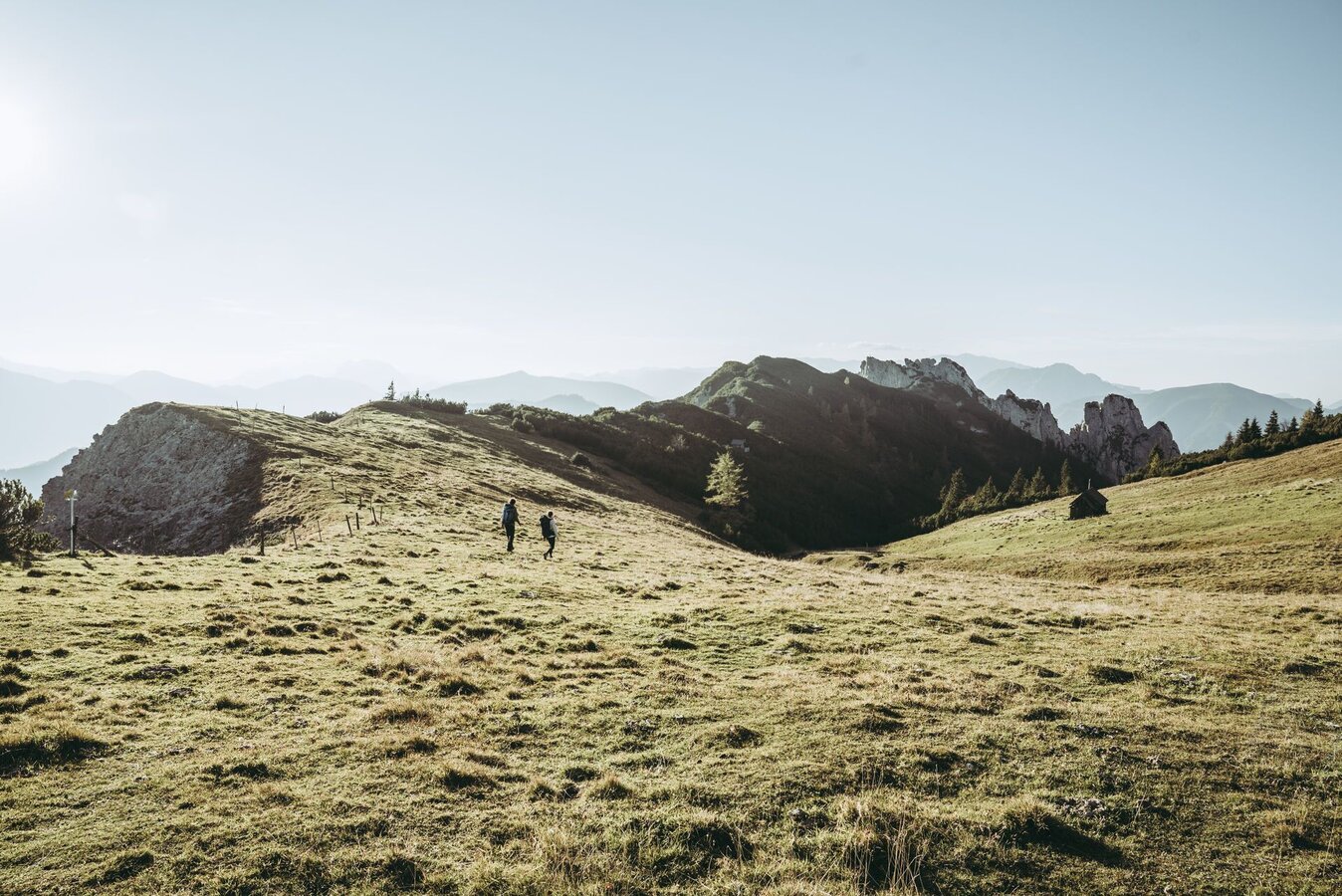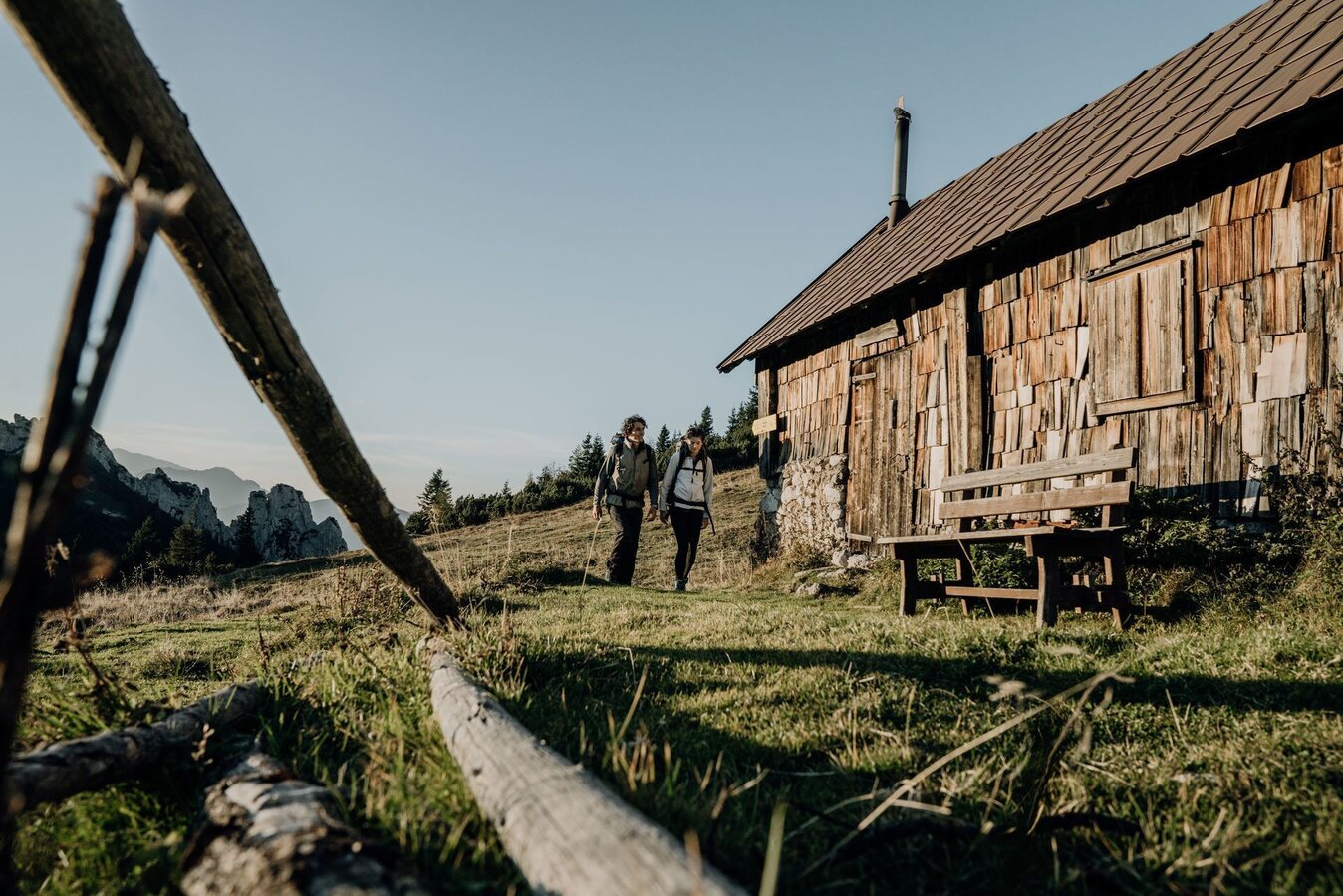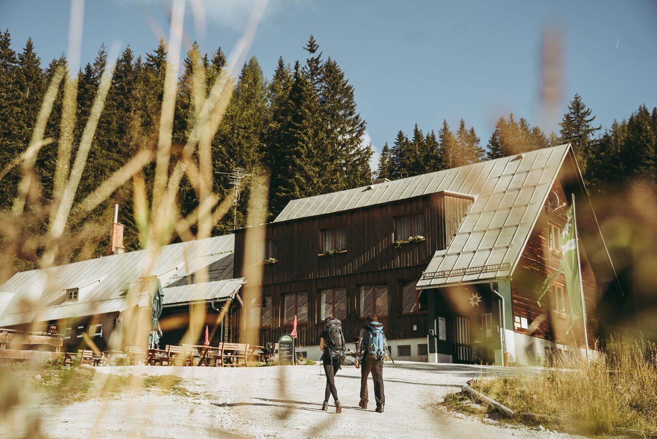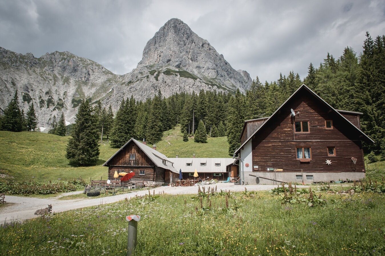 Von hier wählst du nicht den „Jägersteig“ nach Südosten, der zwar direkter zur Klinkehütte führt, jedoch teilweise anspruchsvoll ist und die Schwierigkeiten des Luchs Trails übersteigt. Stattdessen wählst du den kleinen markierten Alpsteig, der nach Süden direkt hinunter Richtung Kaiserau leitet. Du erreichst stetig absteigend das Hochtal der Kaiserau an seinem oberen Ende auf 1.220 m Seehöhe. Von hier wanderst du wieder ansteigend nach Osten und erreichst über einen Wanderweg – einmal die Mautstraße Richtung Klinkehütte querend – in etwa einer Stunde mit der Klinkehütte dein Tagesziel.