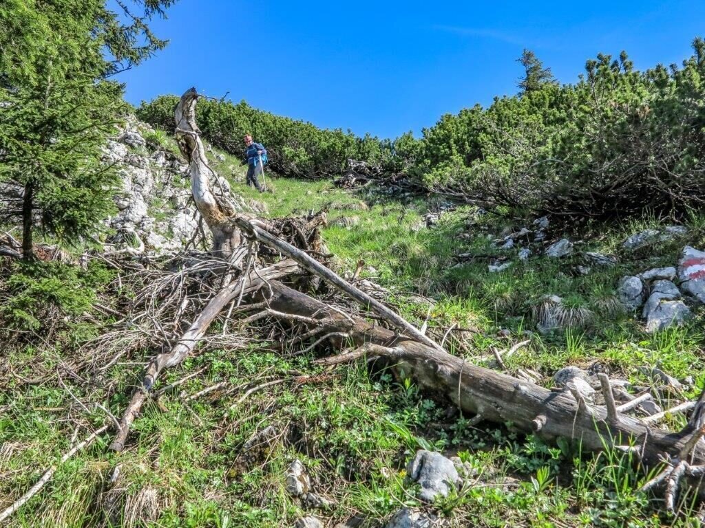 Nach dem Jausenridl geht es einige Meter bergab und es folgt eine Hangquerung an der Hochkar Südseite. Schon bald kommt die