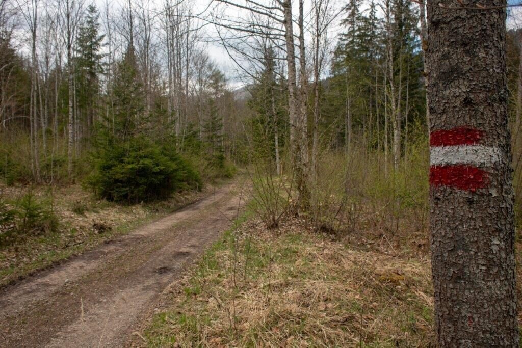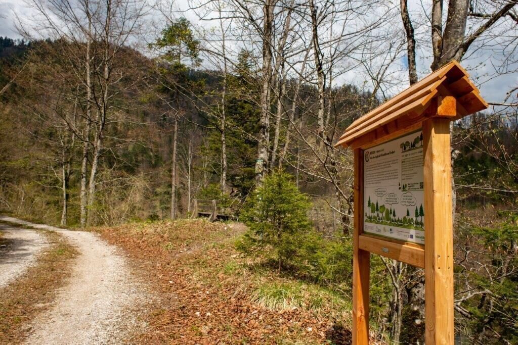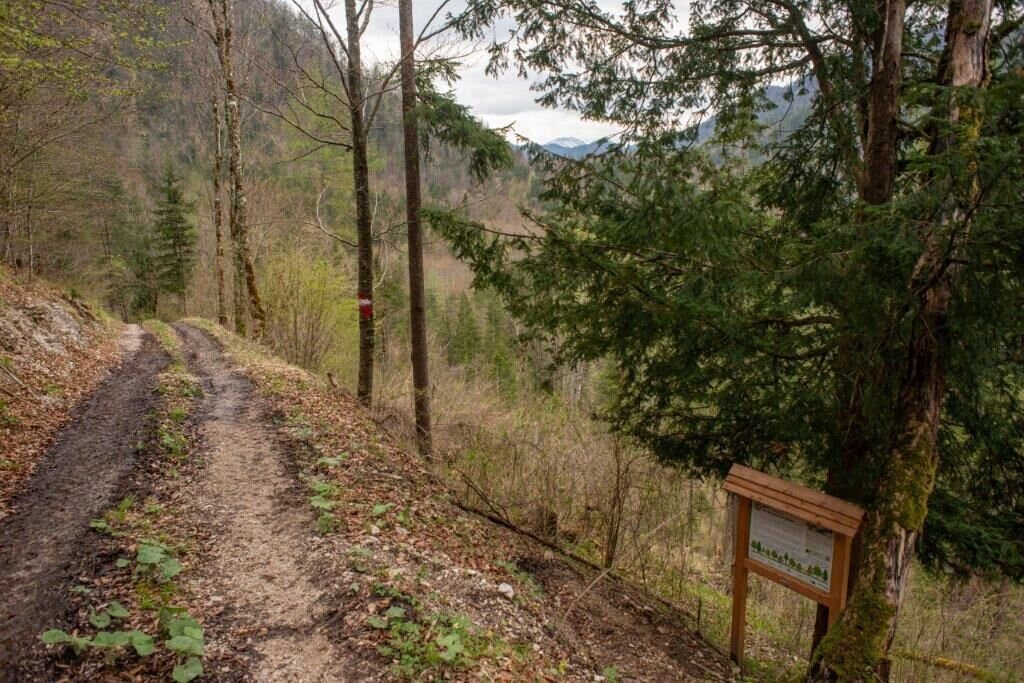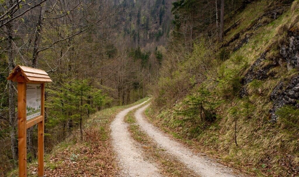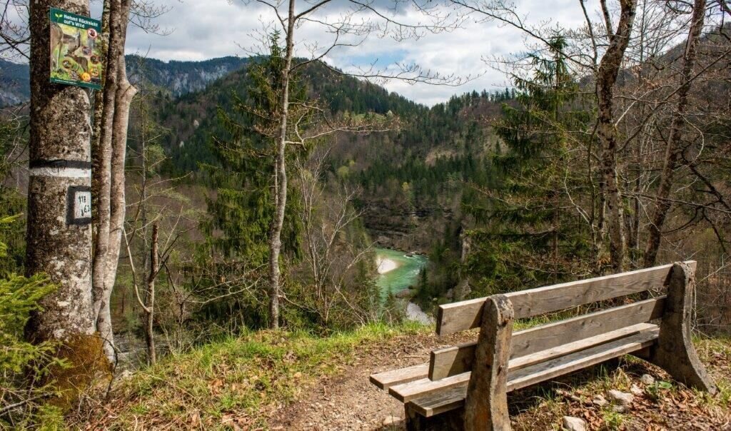 Vor dem Gehöft Kaiserbauer rechts in den Obergamser Weg gehen und dem Weg folgen. Links halten und bei der ersten Kreuzung auch wieder links gehen. Den Thementafeln folgend kommen wir bis zu einem Aussichtsplatz mit tollem Blick auf die Salza mit einem gemütlichen Bänkchen als Rastplatz!