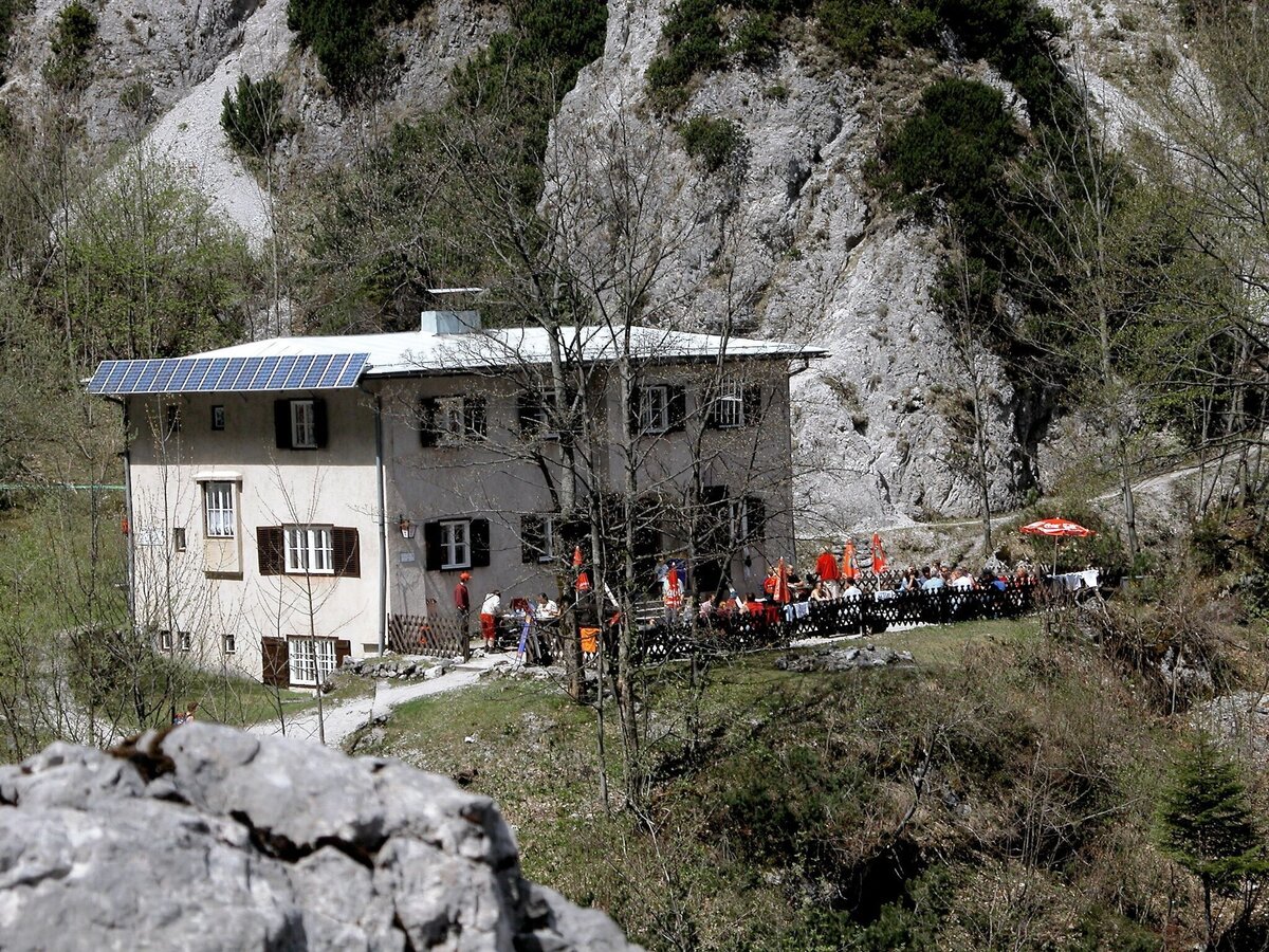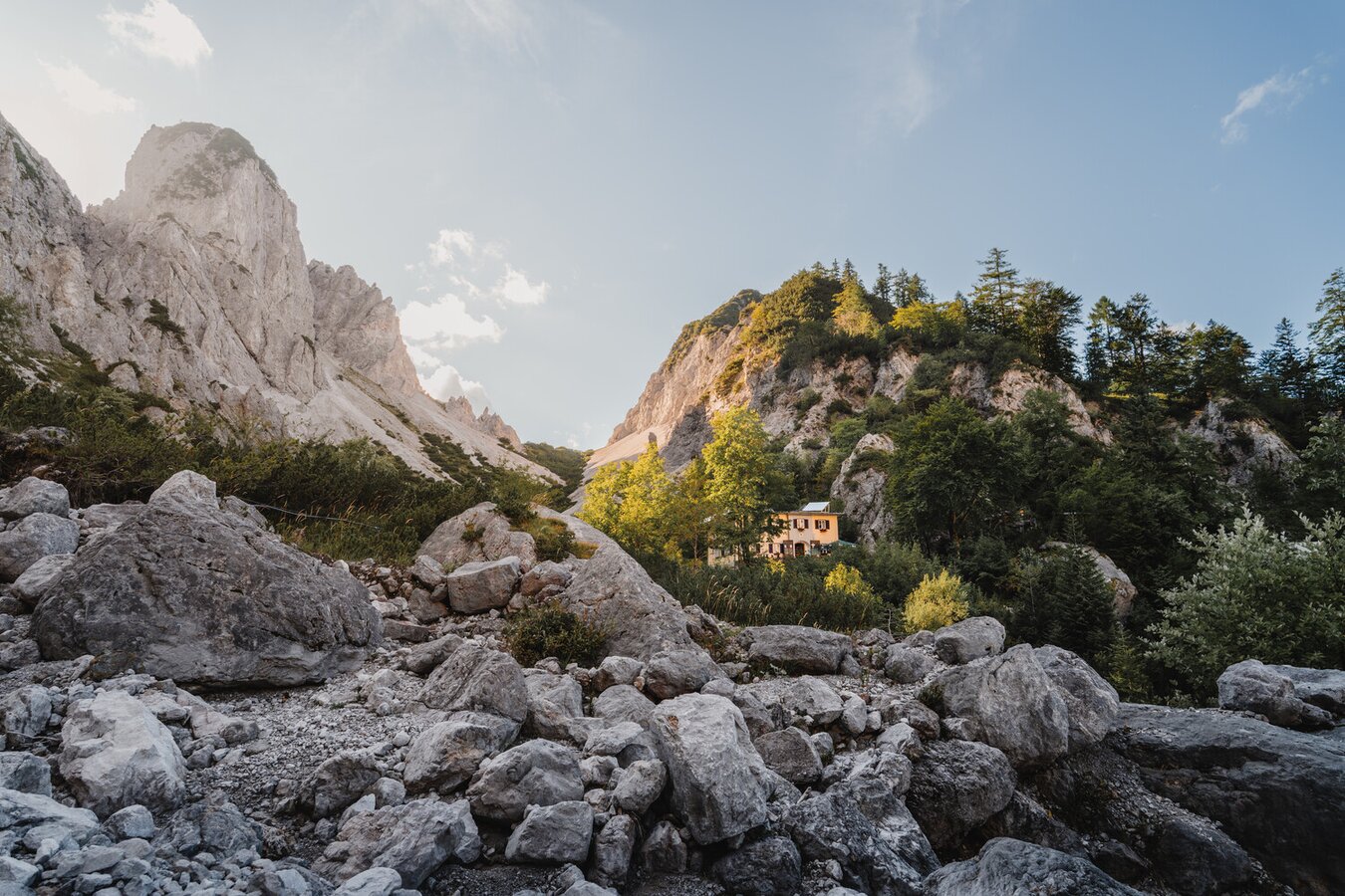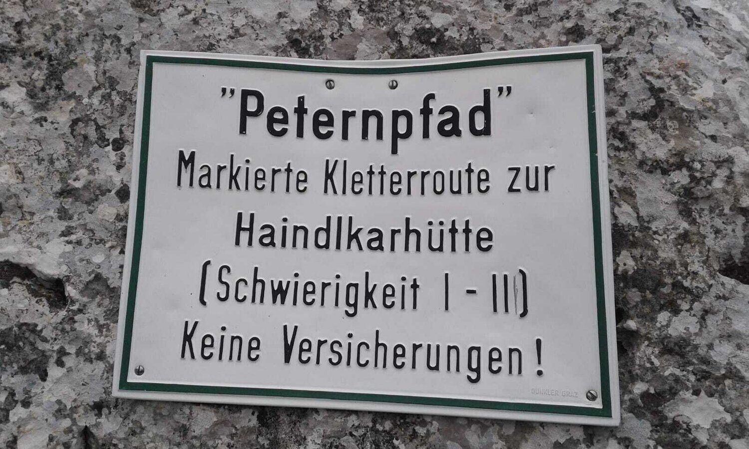 Anfangs wandern wir durch Wald mäßig steil bergwärts, dann durchwegs felsiges, schottriges Gelände. Mehrmals queren wir ein ausgetrocknetes Bachbett und kommen dann schließlich vorbei an der alten Haindlkarhütte. Von dort sind es nur noch ein paar Minuten bis zur neuen Haindlkarhütte. Der Weg ist gesäumt von markanten Felsbrocken, auf denen sich bei entsprechend ruhigem Verhalten des Öfteren Gämsen sonnen. Von der Terrasse bietet sich ein imposanter Ausblick auf die Nordwände der Hochtorgruppe, von wo wir mit etwas Glück mit dem Fernglas den ein oder anderen Kletterer in einer der klassischen Hochtor-Kletterrouten oder Wanderer am Peternpfad entdecken können. Es bietet sich an, auf der Haindlkarhütte zu übernachten und am nächsten Tag gut ausgeruht die vierstündige Tour über den Peternpfad zu gehen.