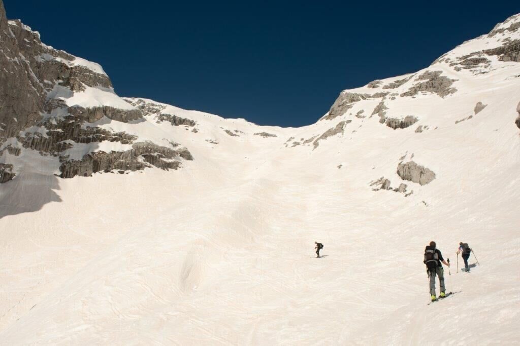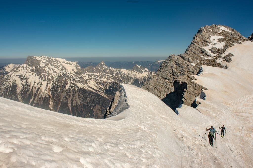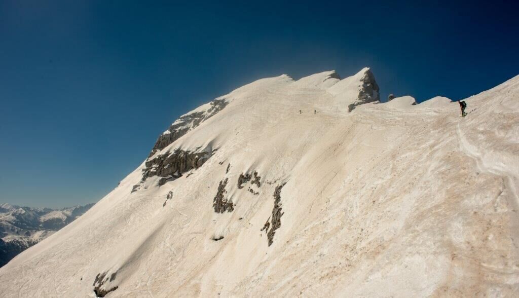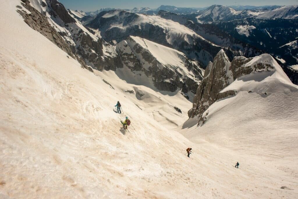 Dort entscheiden ob man zum Gipfel quert. Die Hangneigung beträgt hier zwischen 35 und 40 Grad.