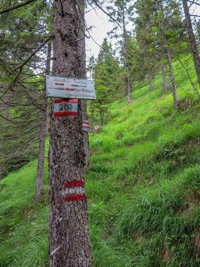 Möglichkeit2) Man fährt über die Campingplatzbrücke, vorbei am Campingplatz und zweigt nach links in den Hopfgarten und fährt über die Hühnermauer bis zur Abzweigung in den Rotwald und dort rechts weiter. Von Wildalpen bis Klaus sind es ca. 10 km.
