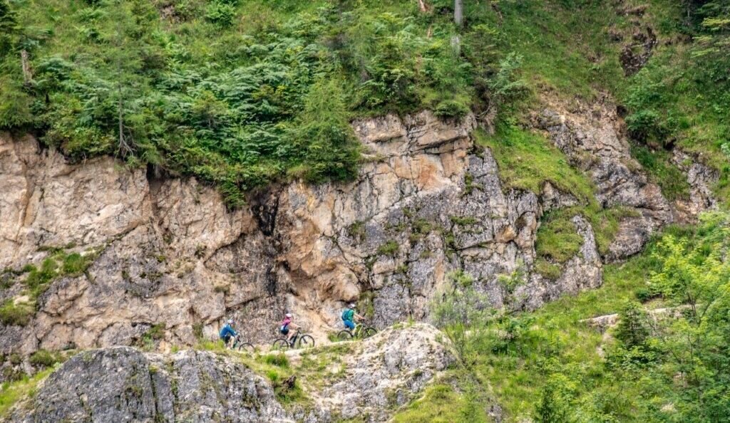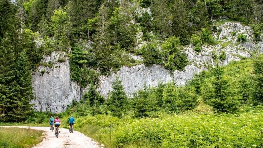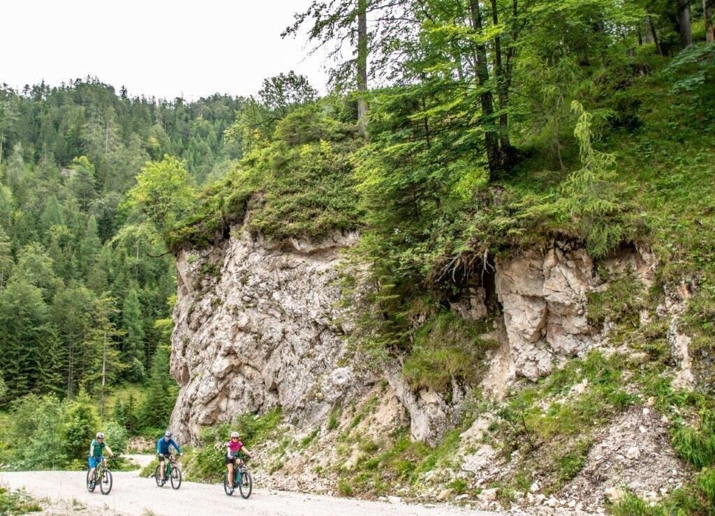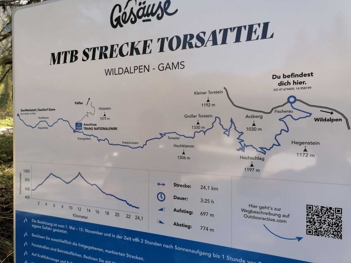 Wir starten in Fischerau (Wildalpen) und fahren der Forststraße entlang bis zum Schranken. Diesen können wir rechts umfahren. Die Strecke führt uns nun immer auf Forststraßen, ohne jemals abbiegen zu müssen, meistens bergauf, vorbei an der Muselhütte auf den Torsattel. Von hier geht es über wunderschöne Almen zwischen schroffen Felsen liegend ständig bergab. Bei einem weiteren Schranken angekommen schieben wir das Rad links vorbei und biegen sofort rechts ab. Nach ca. 18 km kommen wir im Krautgraben auf eine Landstraße. Vor uns sehen wir ein kleines altes Sägewerk, bei dem wir vorbei immer talauswärts den Gamsbach entlang fahren, bis wir zur Abzweigung Anschlussstelle Buchsteinrunde (Trans-Nationalpark) kommen. Wir bleiben weiter geradeaus talauswärts und fahren die wunderschöne Nothklamm bis nach Gams.