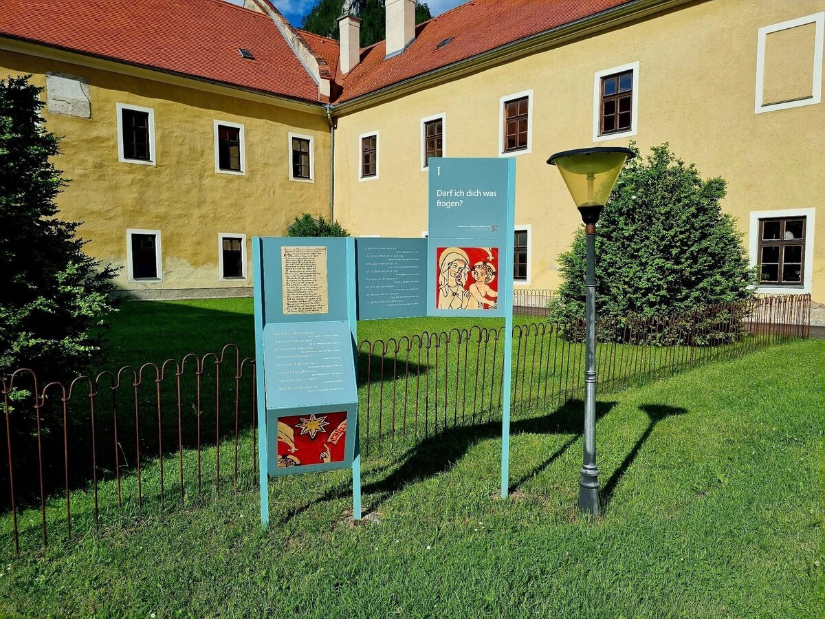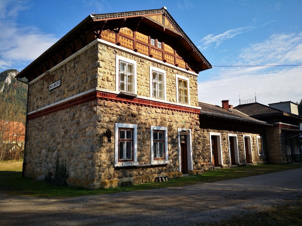 Nun vorbei an der Josef Pillhofer Halle (Besichtigung auf Anfrage möglich) zur Grünangerkirche und weiter, retour sowie der Mürz entlang am historischen Bahnhof Neuberg (hier verweilte einst sogar Kaiser Franz Joseph) vorbei zur Sieberwarte (Abstecher zur Warte, kurzer steilerer Anstieg, Aussichtswarte). Retour von dort ins Ortszentrum (Supermarkt, Gasthof, Trafik, Kalvarienberg, Neuberger Münster und Stift, Glasmanufaktur, Naturmuseum, ehem. 100 - Jahre altes historisches E Werk).