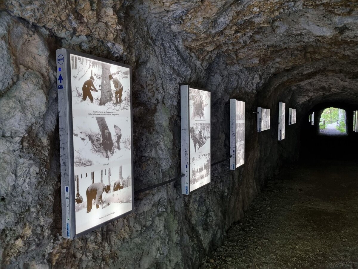 Durch das Tunnelkino hin und retour (alter Weg über die Holzbrücke gesperrt) und, bergauf sowie einige Forstwegabschnitte benützend, nach Neuberg an der Mürz. Den Ort erreichen wir beim Stellplatz für Wohnmobile (gleich in der Nähe Bank, Post, Infobüro, Gemeindeamt, Cafe).