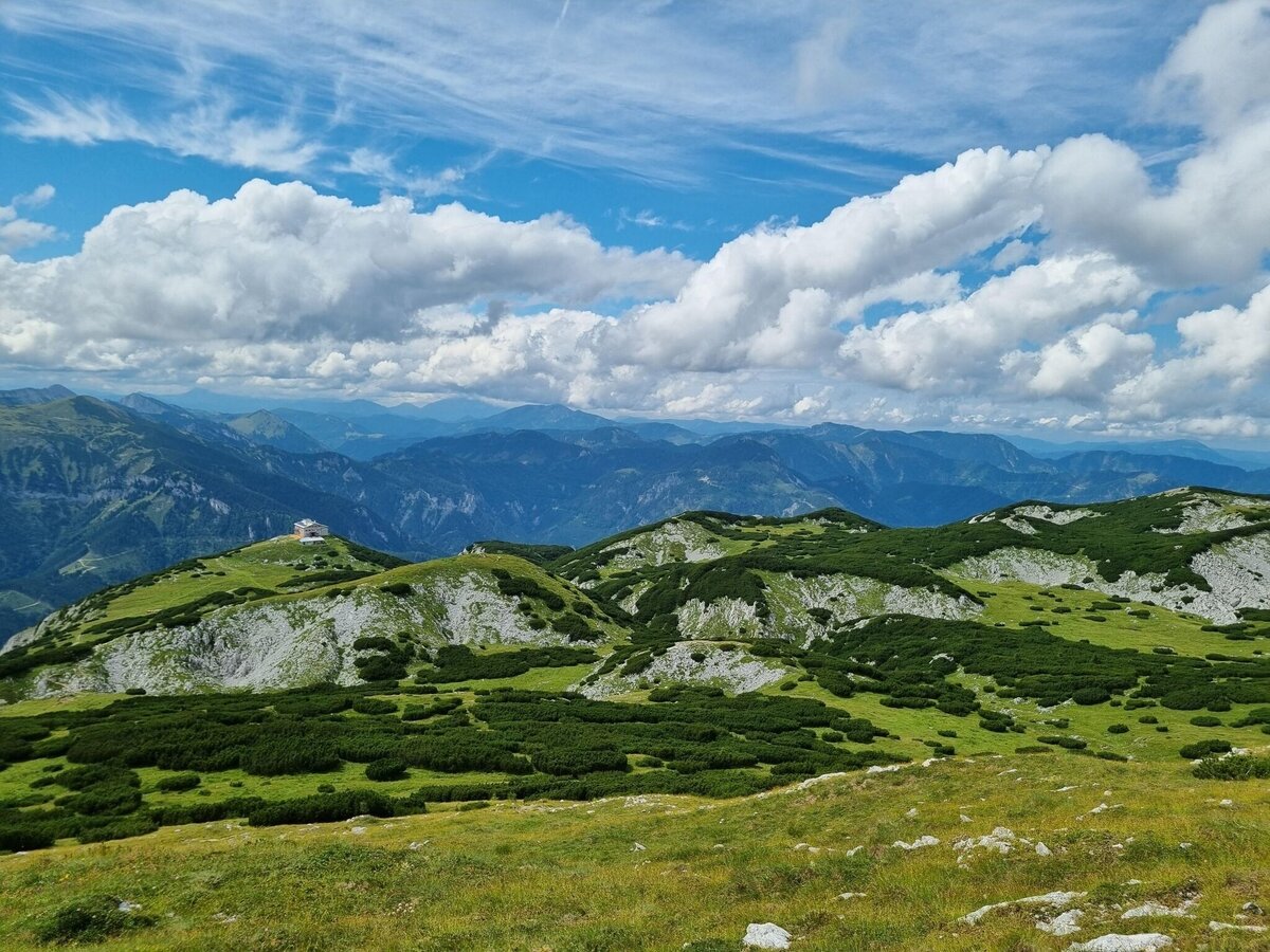Über den recht gut erkennbaren Steig aufwärts (felsig, Schuttfelder) bis zum Habsburghaus und weiter über die Hochfläche zum Karl Ludwig Haus. Nun über die 2.007m hohe Heukuppe zum Einstieg des Zahmen Gamsecksteiges. Über diesen (versichert) abwärts zum Nasskamm und zum P.