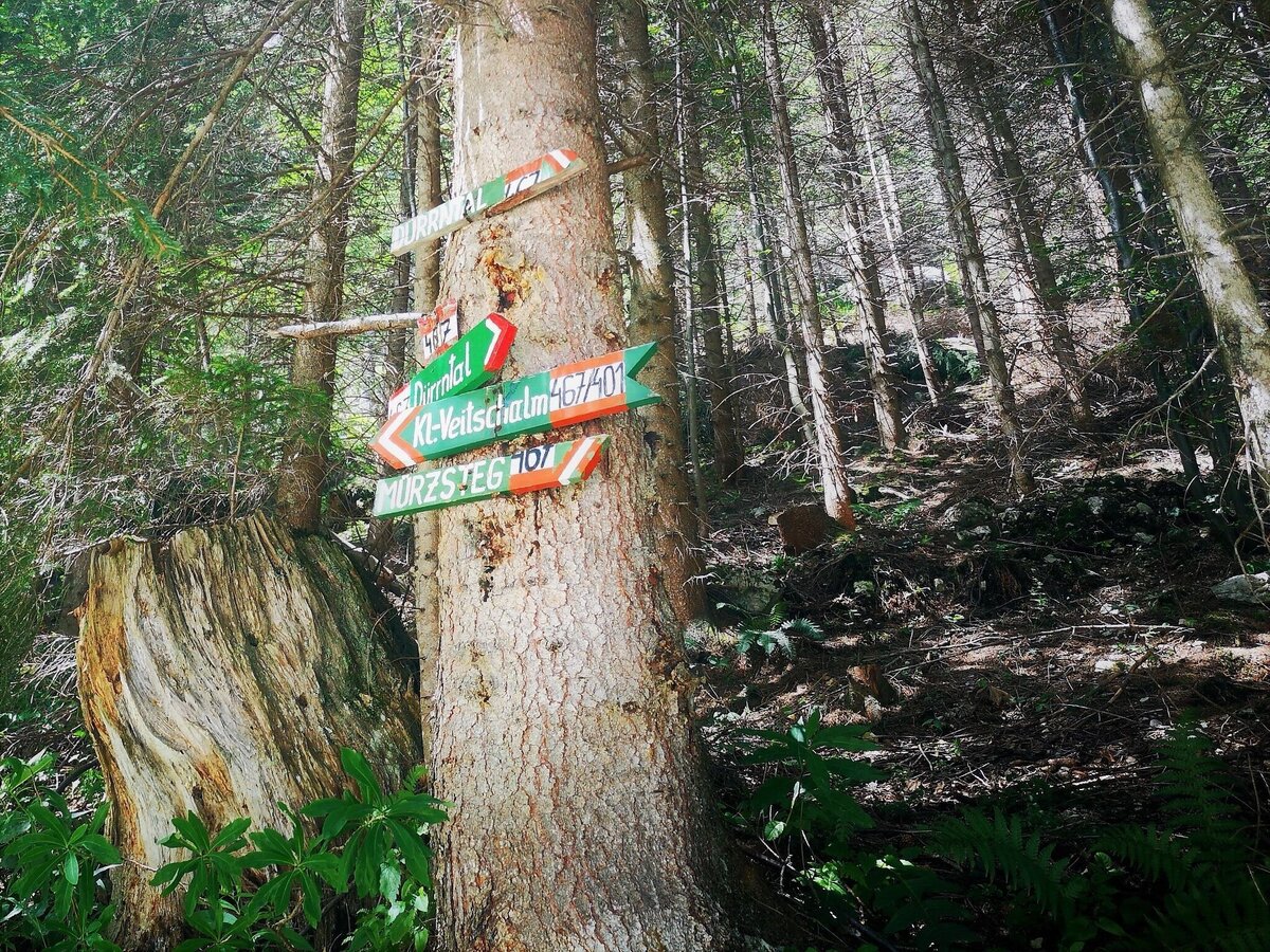 Hier noch zwei Kehren linkshaltend aufwärts und dann, rechts abzweigend, auf einem am Beginn etwas verwachsenen Steig (spärlich markiert) zum Teil auch etwas steiler bergauf in Richtung Kleinveitschalm.