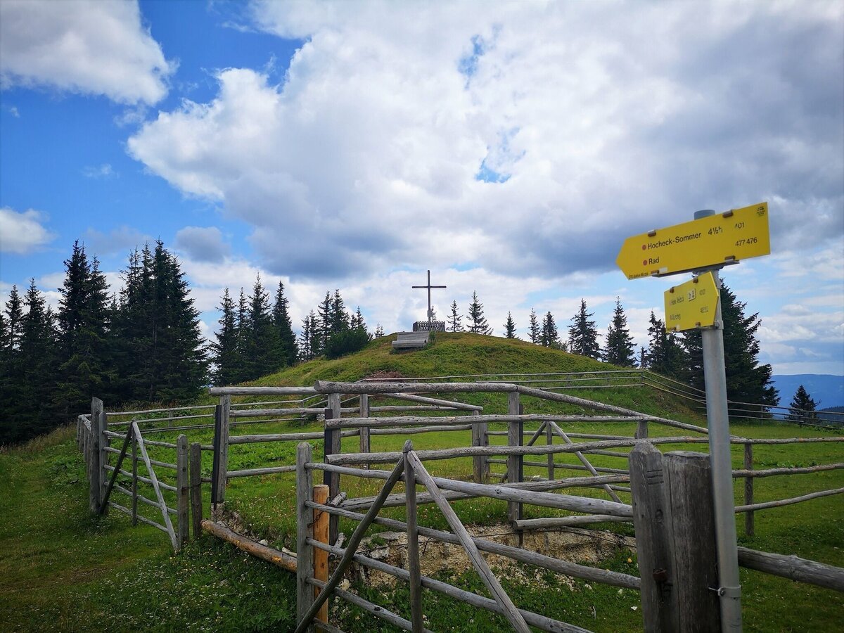 Bei einer Wegkreuzung rechtshaltend (NICHT in Richtung Hocheck!) erneut aufwärts. Nach weiteren 20 - 30 Gehminuten stehen wir dann auf der aussichtsreichen Kleinveitschalm mit dem Gipfel des Blaskögerls. Die Alm ist an Wochenenden meist bewirtschaftet. Retour geht es am Aufstiegsweg.