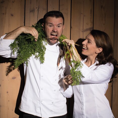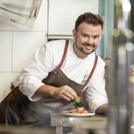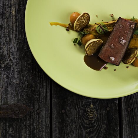 Stefan Eder serviert ausschließlich regioglobale Kulinarik und liebt es dabei Produkte direkt aus der Region zu beziehen. Sein persönliches kulinarisches Highlight-Produkt ist übrigens das saftig-zarte ALMO-Rind. Da wir uns jetzt aber in der Wild-Saison befinden findet man aktuell