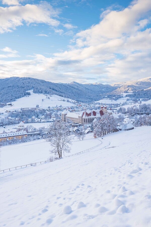 Achten Sie besonders auf die verschiedenen Blickwinkel auf das imposante Benediktinerstift St. Lambrecht. Um mehr zu erfahren können Sie im Benediktinerstift auch im Winter Stiftsführungen besuchen. Machen Sie auch einen Abstecher in den Stiftsgarten, der im Winter besonders viel Ruhe ausstrahlt.