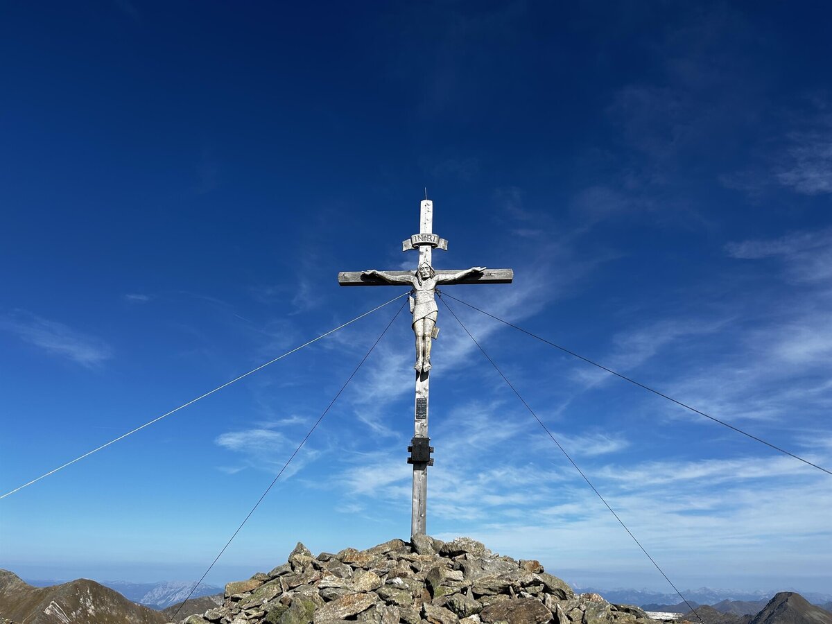 Vom Parkplatz geht man Richtung Sandkogel. Dieser befindet sich auf 2.241 m Seehöhe. Von hier aus hat man bereits einen fantastischen Blick auf die umliegenden Berge und Täler. Weiter bergauf, folgt man den Wanderweg bis zum Greim Gipfelkreuz. Das Kreuz wurde vor wenigen Jahren neu errichtet und auf 2.474 m Seehöhe aufgestellt.