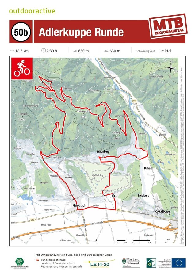 Diese Tour ist bei den Einheimischen in der Erlebnisregion Murtal sehr beliebt und startet beim Radknotenpunkt 50 am Red Bull Ring und führt weiter Richtung Fohnsdorf nach Flatschach. Wo sonst bei Veranstaltungen am Red Bull Ring die Zelte stehen, führt diese Tour auf Schotterweg durch den Wald rauf mit schönen Ausblicken in das Murtal auf die Adlerkuppe in der Erlebnisregion Murtal. Ein kleines Gipfelkreuz (ohne Aussicht) mitten im Wald lädt zu einer kurzen Pause ein und man kann sich sogar in ein Gipfelbuch eintragen. Von nun an geht es bergab und der Downhill auf gemütlichen Schotterweg ist ein absolutes Highlight runter wieder nach Flatschach und zum Red Bull Ring.