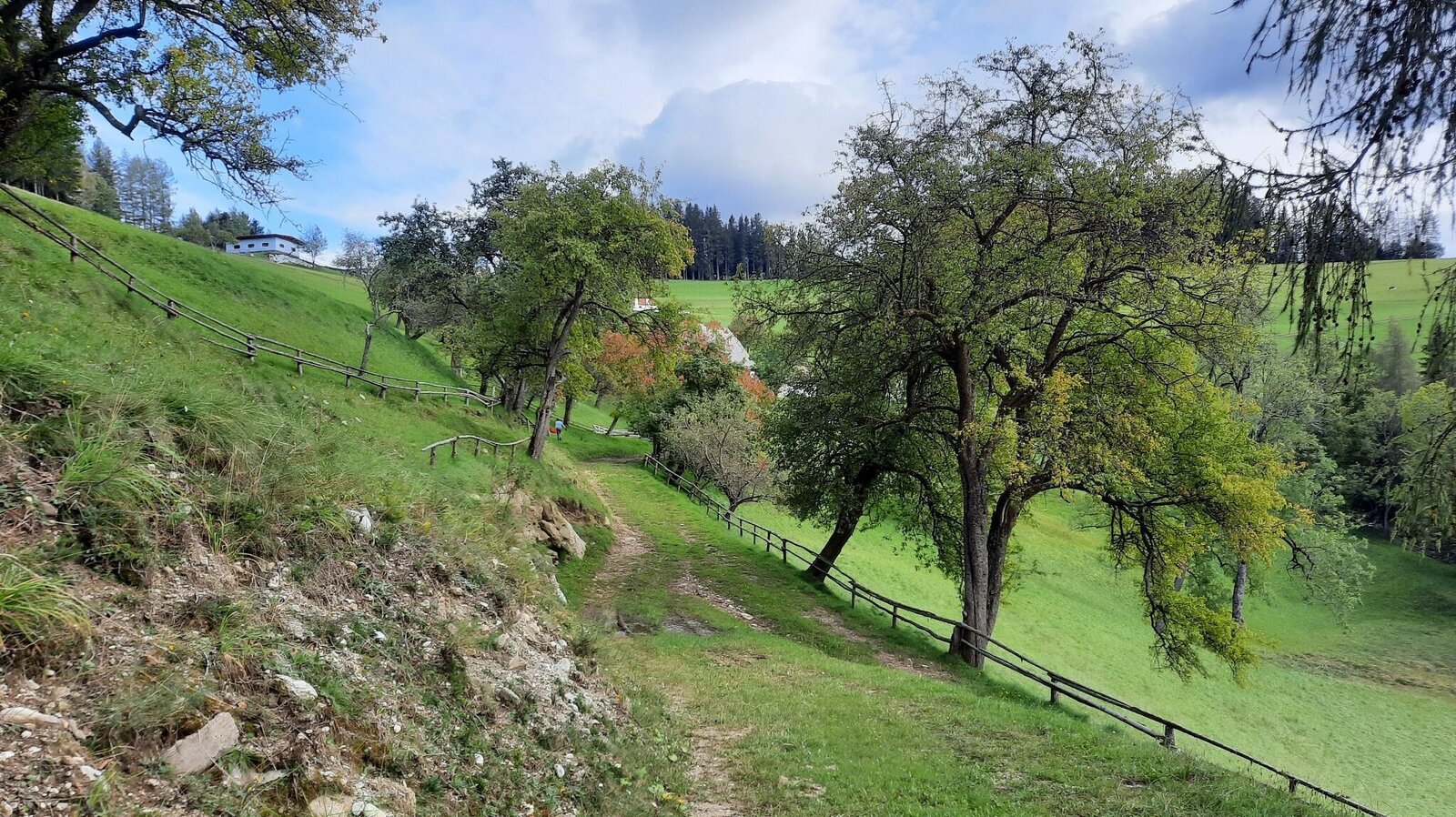 In unmittelbarer Nähe der Informationstafel in Kleinlobming (1), 759 m, führt eine Holzbrücke über den Lobmingbach. Gleich nach der Brücke gehen wir rechts und folgen dem Lobmingtaler Rad- und Erlebnisweg talauswärts. Der asphaltierte Weg führt leicht bergab, beim Skigelände Kleinlobming vorbei und immer entlang des Lobmingbaches. Nach ca. 1 km kommen wir zu einer Brücke, wo wir nun den Rad- und Erlebnisweg verlassen und nach links gehen. Bei den Häusern hindurch und nun kontinuierlich bergauf entlang der Schotterstraße, die über gepflegte Wiesen- und Weideflächen und teilweise auch durch den Wald führt. Der Ausblick auf die gegenüberliegende Sonnseite ist herrlich und die gepflegte Landschaft tut dem Auge gut. Auf einer Seehöhe von 900 m erreichen wir den Bauernhof vlg. Schalk (2). Ein kleines Holzhaus auf Säulen fällt bereits beim Aufstieg ins Auge. Hier ist der Knotenpunkt, wo man sich für die kurze oder lange Variante entscheidet. Weiter geht es nun rechts bergauf, ein kurzes Stück über die Wiese und danach wandern wir im Wald weiter, bis wir zum ersten Tor bzw. Zaun (zurzeit noch ohne Überstieg) kommen. Leicht nach links geht es entlang einer Forststraße bergab weiter, wir bis zu einem weiteren Zaun (zurzeit noch ohne Überstieg) kommen. Auf Wiesenflächen und an schönen alten Obstbäumen vorbei kommen wir zum dritten Tor (zurzeit ohne Überstieg) und erreichen den Bauernhof vlg. Unterer Harmenter (3), 957 m. Weiter gehen wir entlang der Zufahrtsstraße des Bauernhofes bergauf, bis wir die Gaberl Bundesstraße erreichen und uns links halten. Nach etwas mehr als 100 m zweigt links eine Straße ab, der wir folgen und beim Bauernhof vlg. Oberer Harmenter (4), 1000 m, hindurchgehen. Wir wandern leicht bergab entlang einer Forststraße durch den Wald, bis wir in einer Rechtskurve die Straße verlassen und links auf den Wanderweg weitergehen. Wir halten uns in einer Linie bergab und kommen zu dem uns bereits bekannten Tor bzw. Zaun. Zurück zum Bauernhof vlg. Schalk (2), 900 m, geht es über die Aufstiegsroute. Unter dem alten Bauernhaus und an der neu renovierten Kapelle vorbei führt der Wanderweg über die Wiese zu einem kleinen Bacherl. Weiter wandern wir im Wald gemütlich dahin, bis wir die Skipiste Kleinlobming erreichen und den Hang leicht bergab queren. Auf einer Schotterstraße wandern wir nun bergab und erreichen in Kürze unseren Ausgangspunkt.