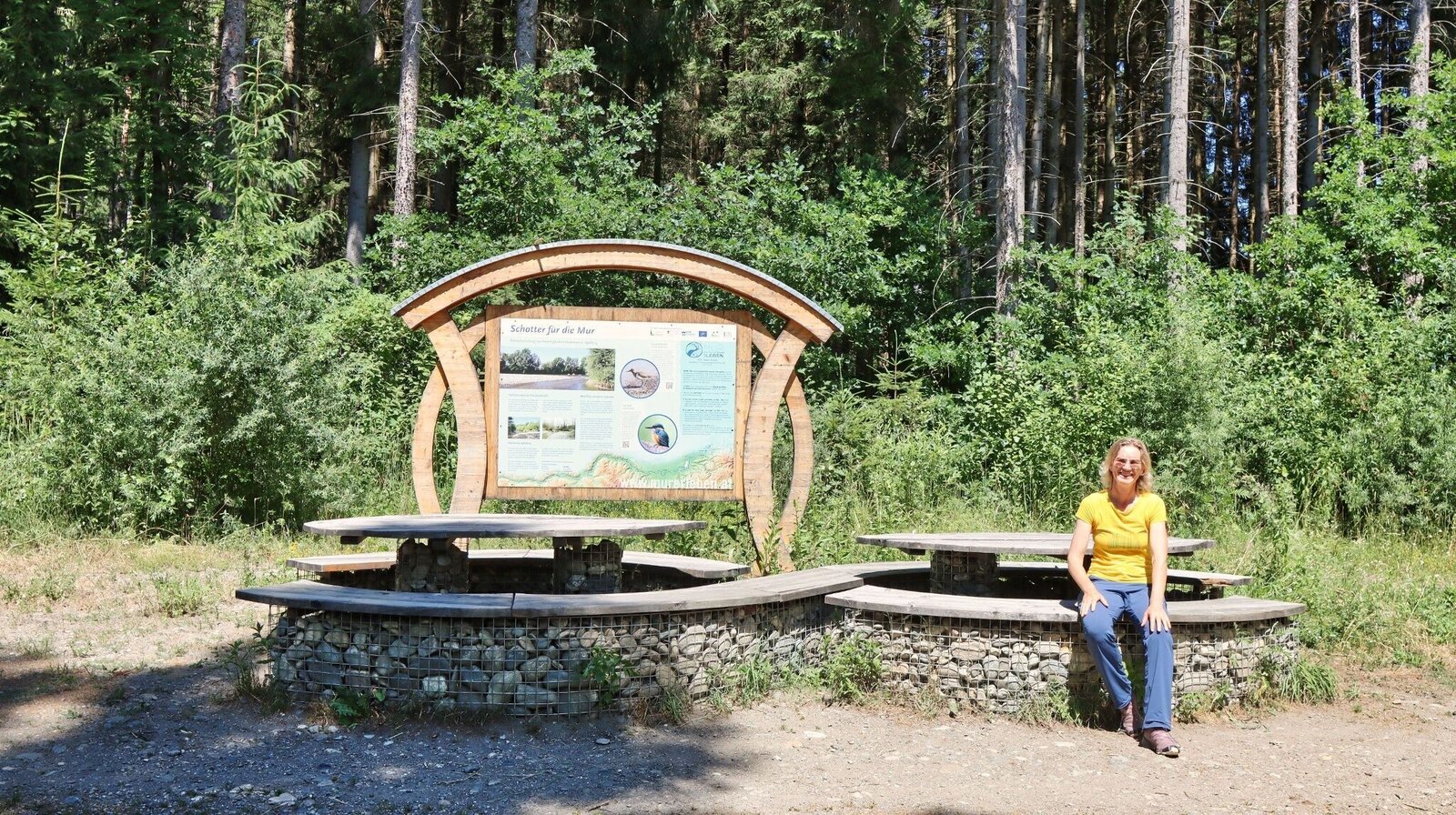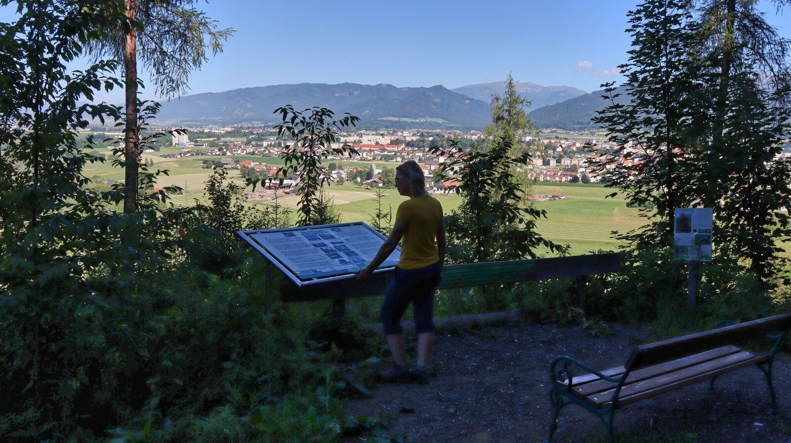 Am Hauptplatz in Knittelfeld (1), 643 m, orientieren wir uns an der Stadtapotheke und der naheliegenden Kirche, an der wir vorbeigehen, um auf die Esperantostraße zu kommen. Wir halten uns rechts und gehen in Richtung Großlobming. Weiter entlang der Stubalpenstraße stadtauswärts, bei der Feuerwehr Apfelberg vorbei, bis wir die Murbrücke überqueren. Gleich darauf sehen wir auf der rechten Seite das Gasthaus Hoffelner (2), 626 m, (Parkmöglichkeit) und links unseren weiteren Wegverlauf, nämlich eine Schotterstraße. Beim Gelände der Hundeschule vorbei, geht es ein kurzes Stück noch eben dahin, bis die Schotterstraße kontinuierlich durch den Wald bergauf führt. Zwischendurch kommen wir zu gemütlichen Rastmöglichkeiten mit Panoramatafeln und schöner Aussicht vorbei. Nachdem wir die Anhöhe erreicht haben, kommen wir direkt zum Thalberghof (3), 803 m, einem gekannten Ausflugsgasthof in der Region Murtal. Gleich nach dem Thalberghof zweigen wir bei der Kreuzung nach rechts ab und gehen die Straße, die wenig ansteigt, entlang. Unter der Hochspannungsleitung hindurch, kommen wir noch bei einem Rastplatz mit einer Panoramatafel vorbei und sehen gleich links den gelben Wegweiser in Richtung Naturfreundehaus Steinplan. Ab nun beginnt der Aufstieg, der teilweise etwas steiler ist. Entlang von Forststraßen und über Wiesenwege erreichen wir den Bauernhof vlg. Sattelbauer (4), 922 m, wo der Wanderweg unmittelbar zwischen Haus- und Hofstelle führt. Hier halten wir uns rechts und gehen die Zufahrtsstraße leicht bergab, bis wir auf der linken Seite die Hinweisschilder zur Radroute sehen. Ab nun führt der Wanderweg auf dem Radweg weiter, so gehen wir im leichten Auf und Ab entlang der Forststraße durch den Wald, bis wir links dem Richtungspfeil des Radweges bergauf folgen. Kurz darauf kommen wir zu einer Kreuzung mit einem Weiderost, wo wir uns rechts halten, um in Folge ca. 1 km fast eben dahin, bis zum Murtalblick-Bankerl (5), 860 m, weiterzugehen. Die Aussicht auf das Judenburg-Knittelfelder Becken und die umliegenden Bergregionen der Wölzer- und Seckauer Tauern ist herrlich. Vom Bankerl gehen wir wieder einige Meter zurück, um dann links auf dem gut markierten Weg, auf Schotter- bzw. Asphaltstraßen, bergab zu wandern. Fast im Tal angekommen sehen wir bei einer Kreuzung (6), 660 m, auf der rechten Seite den gelben Richtungspfeil. Wir zweigen nach links ab und wandern am Waldrand entlang, bis wir das besiedelte Gebiet von Großlobming (7), 641 m, erreichen. Bei der Kirche vorbei, halten wir uns in Richtung Mur und kommen zum Campingplatz Murinsel. Weiter geht es über die schmale Mur-Autobrücke und kurz darauf, bei einem großen Schotterplatz, rechts weiter entlang der linken Uferseite der Mur. Ein schöner Weg führt durch das Augebiet und zur Ingeringmündung (8), 628 m. Weiter geht es über die Holzbrücke und entlang der Schotterstraße, bis wir die Asphaltstraße erreichen und uns nun rechts halten. Nach kurzer Zeit erreichen wir die uns bereits bekannte Kreuzung, halten uns links und wandern zurück ins Zentrum bzw. zum Bahnhof von Knittelfeld.