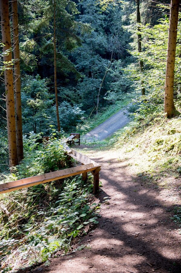 Der Weg zum Hexenpfad führt von der Kirche im Ort entlang einer asphaltierten Straße, bevor ein steiler sehr kurzer Anstieg in den Wald folgt. Der Weg ist durch "Hexenschilder" gut gekennzeichnet und leicht zu finden. Hexenhäuschen, Baumhoroskope, Waldxylophon und Hexengallerie bringen Abwechslung und wecken die Entdeckungsgier. Als krönender Abschluss wartet eine Waldkugelbahn. Kugeln sind vorhanden, es empfiehlt sich jedoch hier eine Holzkugel oder Hüpfball mitzubringen.