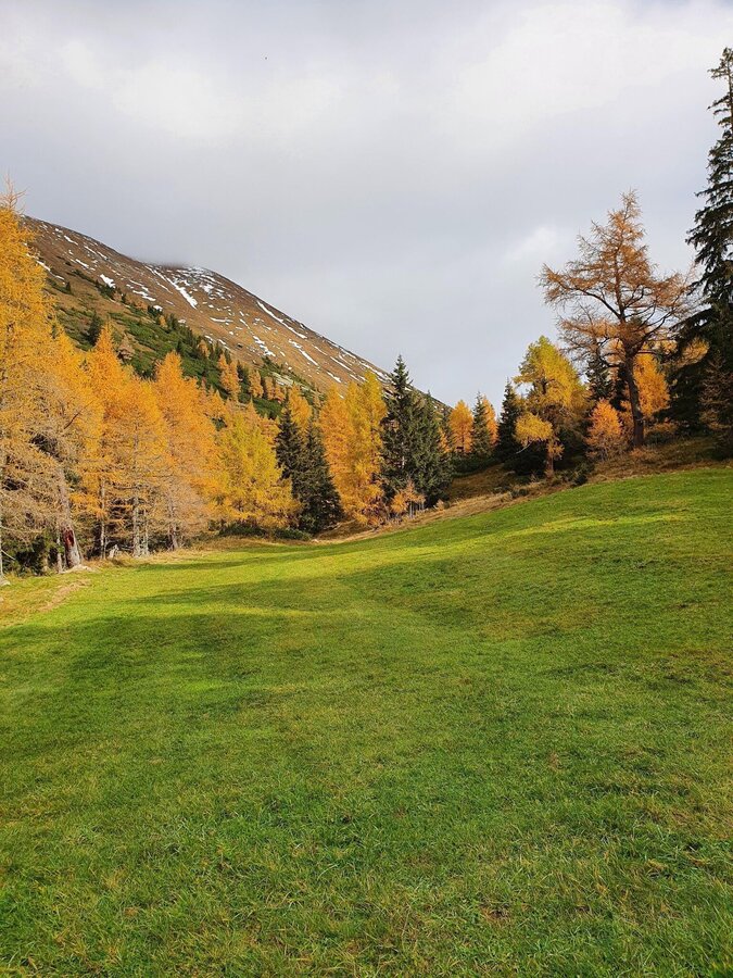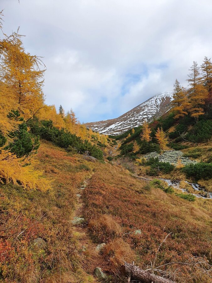 Zirka drei Kilometer folgen wir der Forststraße durch den Vorwitzgraben und gewinnen dabei ungefähr 300 Höhenmeter. Kurz nach der Balduinhütte verlassen wir die Straße und folgen einer gut ersichtlichen Tafel, die den Weg in Richtung Vorwitzsattel anzeigt. Immer perfekt markiert schlängelt sich der Weg neben dem Vorwitzbach (in den Sommermonaten eine ideale Möglichkeit, um sich abzukühlen) Meter für Meter in die Höhe. Gerade im Herbst gibt die Landschaft wirklich viel her: dass noch immer satte Grün der Latschen und im Kontrast dazu das Gelb der Kiefern – Indian Summer, quasi vor der Haustüre.