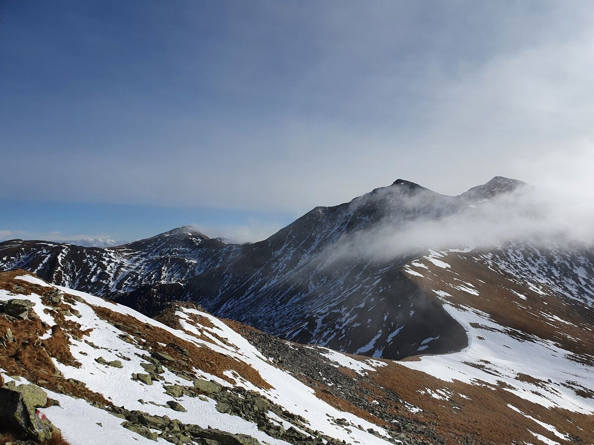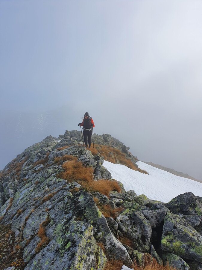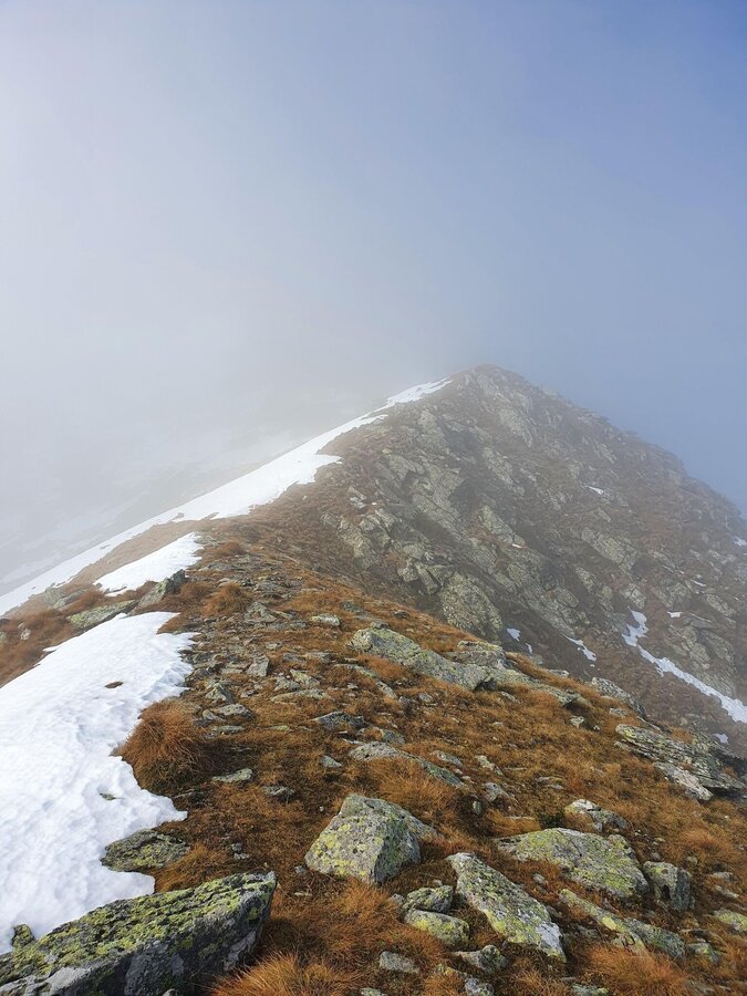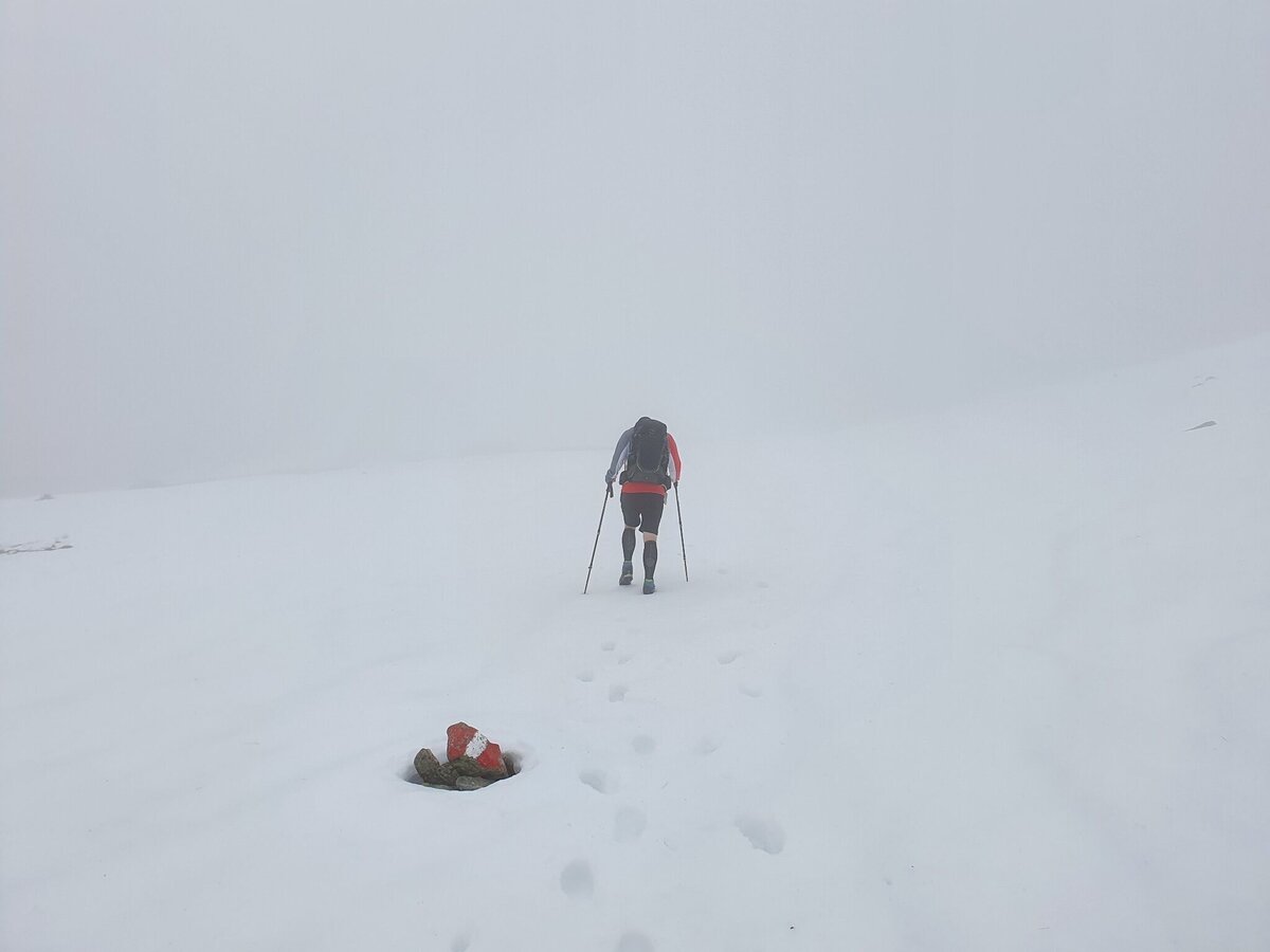 Wir waren auf zirka 1.800 Meter Seehöhe, als sich uns immer mehr Schneefelder in den Weg stellten – diese waren aber kein wirkliches Problem für uns. Eher der einfallende Nebel und der zunehmende Wind. Faktoren, die diesen Teil unserer Tour etwas ungemütlich machten. Die Sicht verschlechterte sich zunehmend und gefühlt nahm der Wind mit jedem Schritt um 1 km/h zu. Das Weiß des Schnees war nicht mehr vom Weiß des Nebels zu unterscheiden und so folgten wir konzentriert den noch sichtbaren Markierungen und waren erleichtert, als wir nach zirka 2,5 Stunden reiner Gehzeit am Vorwitzsattel eintrafen.