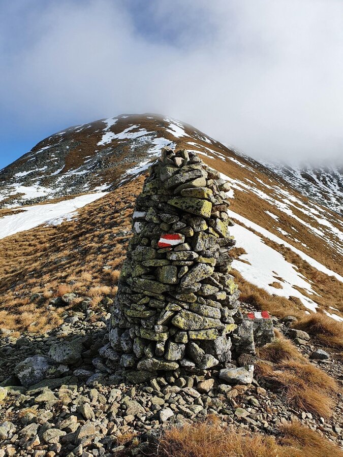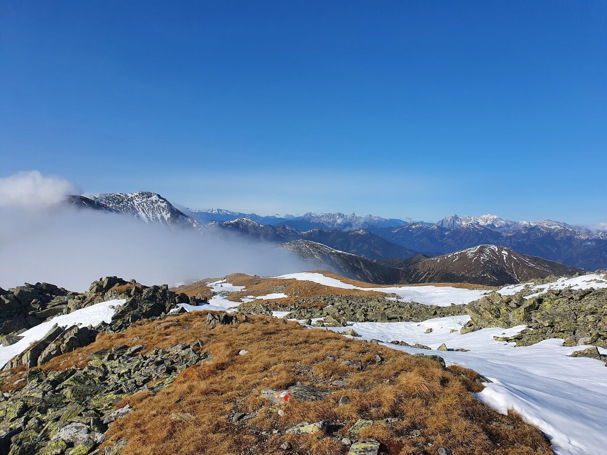 Rechts führt der Weg zum Kleinen Zinken und danach auf den Seckauer Zinken, wir hielten uns links und stapften bei schlechter Sicht und immer wieder zugeschneiten Wegen dem Gipfel entgegen. Es dauerte nicht lange, da hörte der Wind weitestgehend auf und auch der Nebel verzog sich und uns bot sich ein unglaublich schönes Bergpanorama. Die ersten 100 Höhenmeter ab den Vorwitzsattel gestalteten sich etwas schwieriger, da wir den zugeschneiten Weg oftmals umwandern/umkraxeln mussten. Aber auch die Steine und das Gras waren relativ feucht, somit war Vorsicht geboten. Je näher wir dem Gipfelkreuz kamen, umso freundlicher wurden die Bedingungen. Kein Wind, es wurde spürbar wärmer, ein schneefreier Weg – ein Traum.
