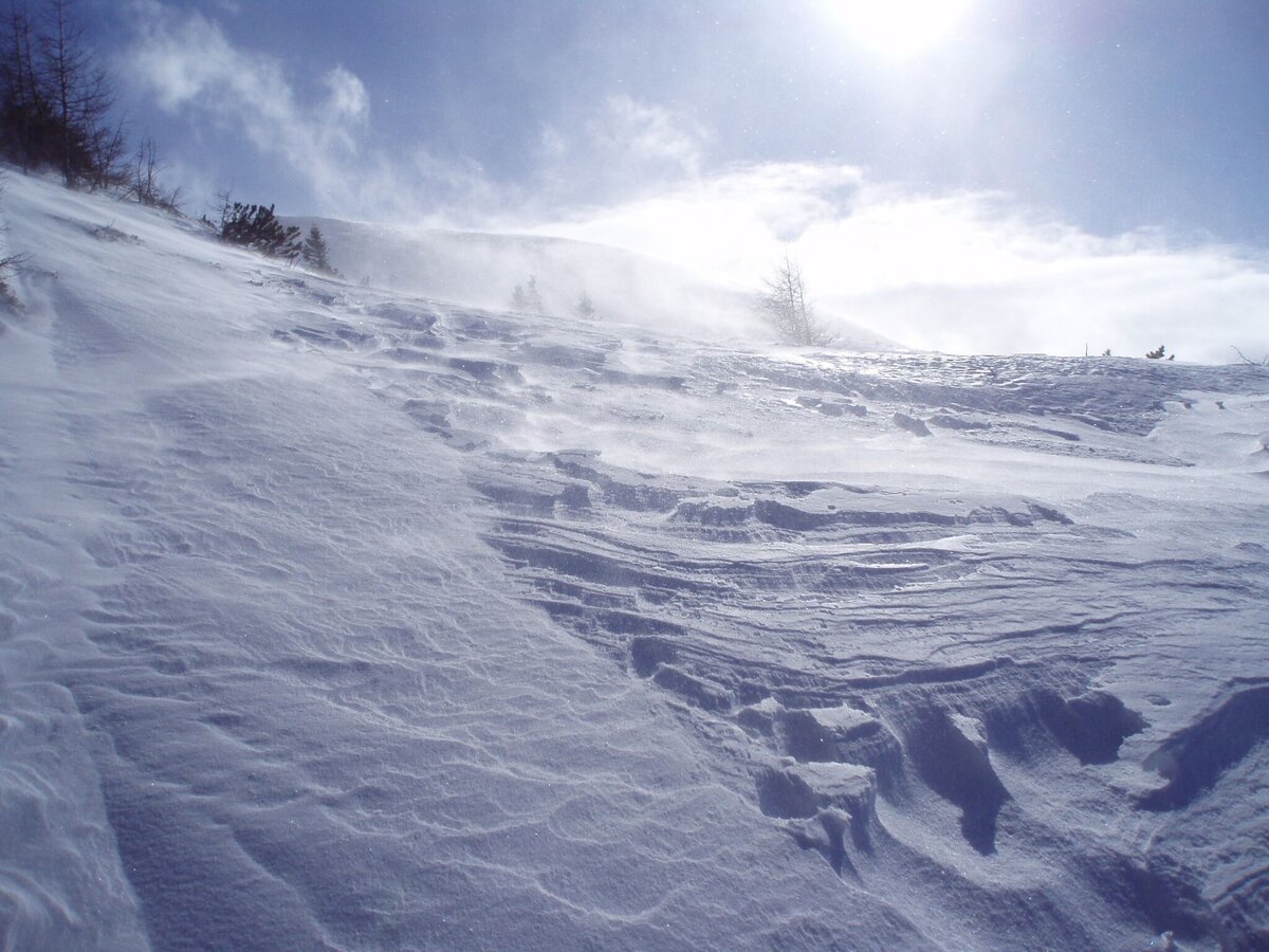 Oft weht über der Waldgrenze der Wind, daher ist der Schnee in diesem Bereich manchmal windgepresst.