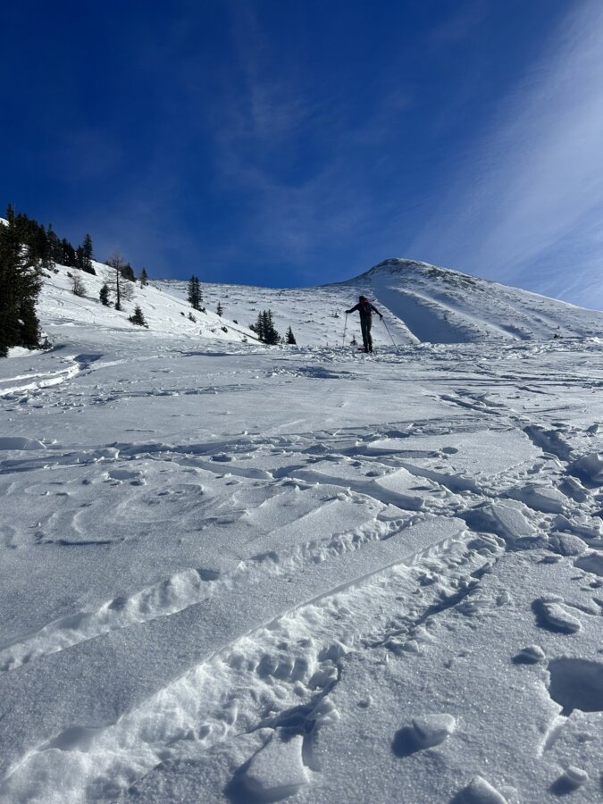 Man steigt sicher 200 Höhenmeter über diesen Rücken auf. Im darauffolgenden Wald gibt es eine kleine Schneise, der man gut folgen kann. Auch für die Abfahrt lässt sich dieser Bereich gut nutzen. Über diese Schneise erreicht man die Waldgrenze. Hier folgt man dem breiten Rücken. Das letzte Stück zum Gipfel bewältigt man über den Nordrücken zum Lattenberg. Aufpassen auf die Wechten in Richtung Liesingkar.