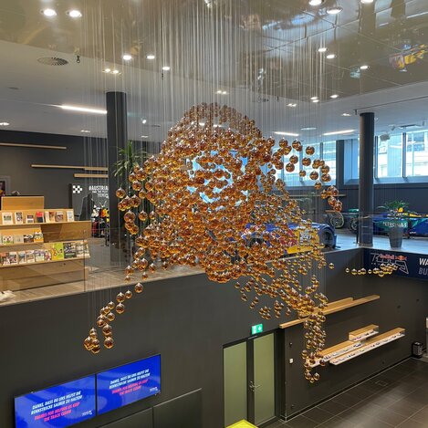 Doch der Stahlbulle ist nicht der einzige „tierische“ Murtaler am Gelände des Red Bull Rings. Während er stattlich in der Mitte der Rennstrecke das Motorheulen und Adrenalinspektakel genießt, bevorzugt es sein kleiner Bruder gemütlicher und hängt indoor im Welcome Center ab. Freilich bekommt er vom Renngeschehen hier nicht so viel mit, jedoch ist das vielleicht auch besser so. Er ist etwas zerbrechlicher als sein stählernes Vorbild, denn er besteht aus 1.340 handgefertigten Kristallglaskugeln. In bernsteinfarbener Optik beeindruckt er hier die Besucher der Fahrzeugausstellung und beobachtet Kinder beim Rennabenteuer auf dem Carrera Red Bull Ring unter sich. Leider war er für ein Interview zu schüchtern.