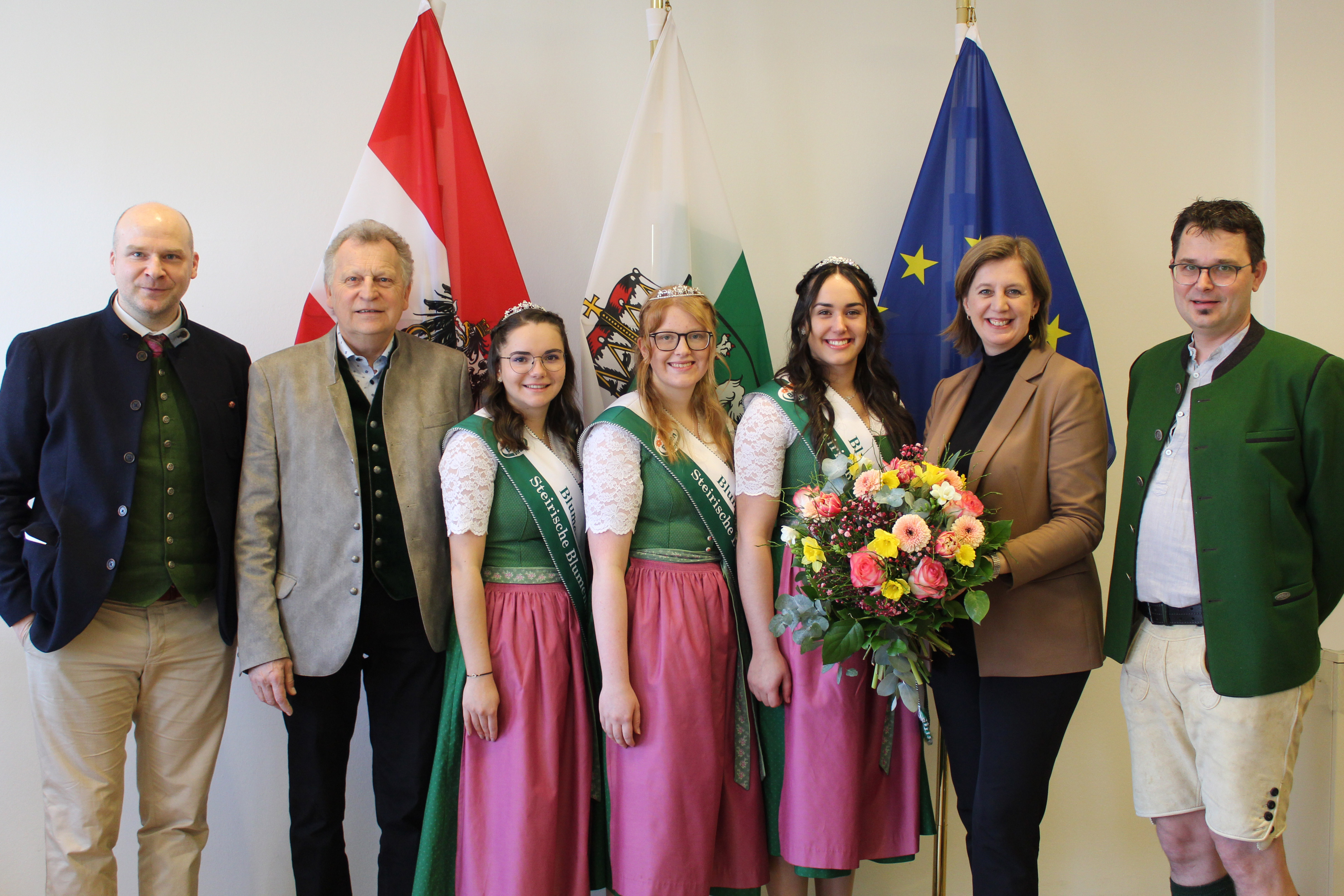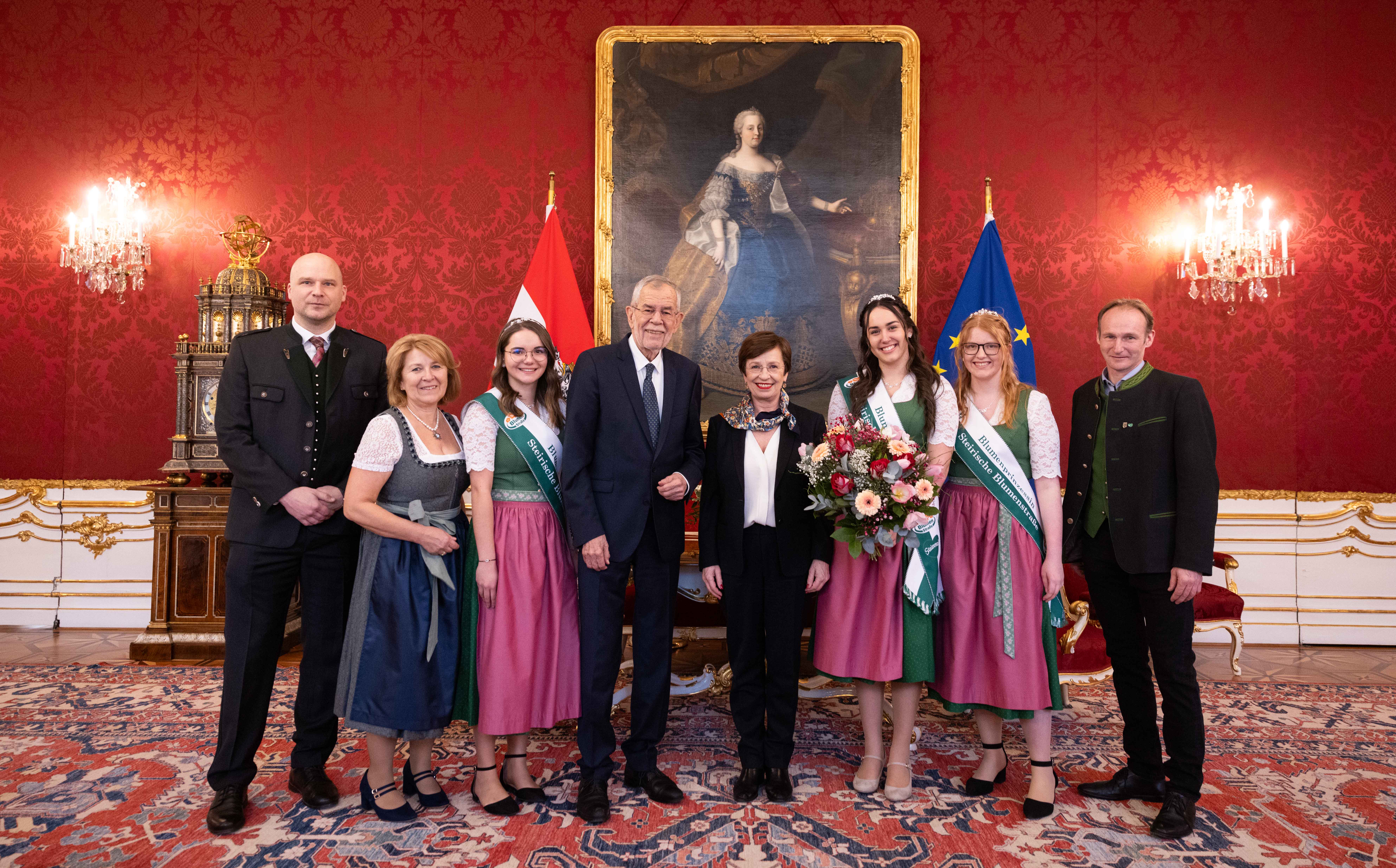 Schloss 1 | 8225 Pöllau bei HartbergBundespräsident Alexander Van der Bellen empfing mit großer Herzlichkeit die für zwei Jahre neu gewählten Blumenhoheiten in der Wiener Hofburg. Landeshauptmann Christopher Drexler lud in die Grazer Burg, Landesrätin Barbara Eibinger-Miedl in ihr Büro am Grazer Nikolaiplatz. Im Fokus des Austausches standen die neuesten Entwicklungen rund um die Steirische Blumenstraße und ihre touristische Bedeutung als von Wien und Graz sehr nahe Destination.