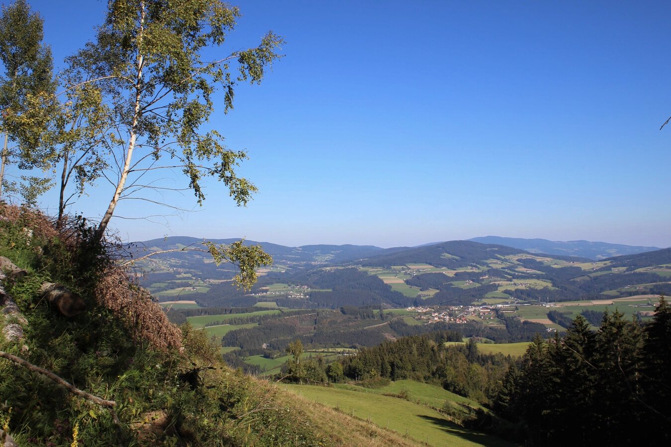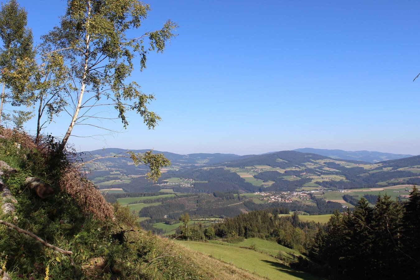 - Nun folgen wir wieder der Hinweistafel „Um den Königskogel“, zuerst leicht bergab, dann wieder bergauf. Zwischendurch haben wir Aussicht auf das teilweise extreme Bergbauerngebiet der Oberen Haslau.