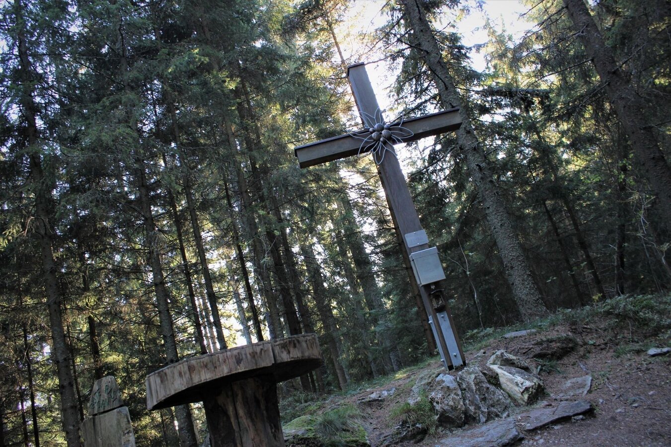 - Auf dem sanften, fast romantischen Waldweg gelangen wir schließlich zu einem Bildbaum (gekreuzigte Christusskulptur).