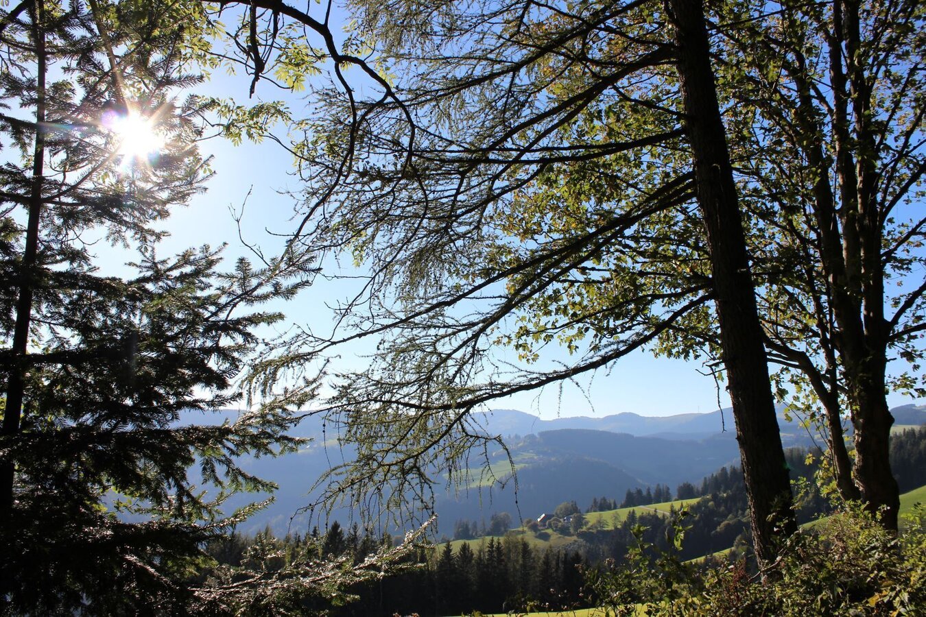 - Der schöne Wanderweg führt anfangs gemütlich durch Weideland und zieht dann im Wald bergauf – wir folgen immer den Almenland Hinweistafeln.
