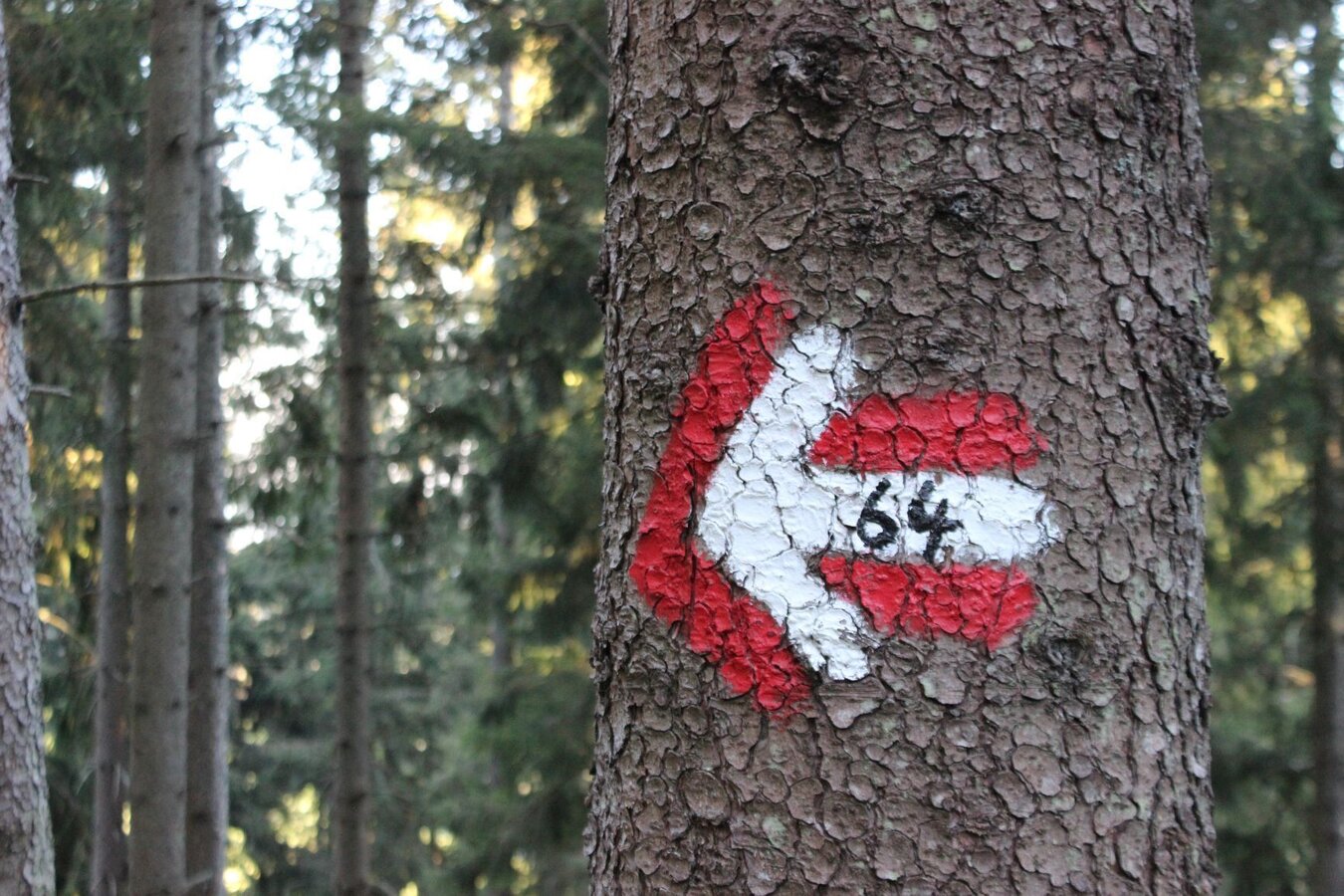 - Wenn der Forstweg endet, gehen wir den schönen Waldsteig weiter zur Kreuzung und treffen dort auf den "Königskogelweg Nr. 64", der vom Offener Kreuz heraufkommt und weiter zum Königskogel-Gipfelkreuz im Wald führt.