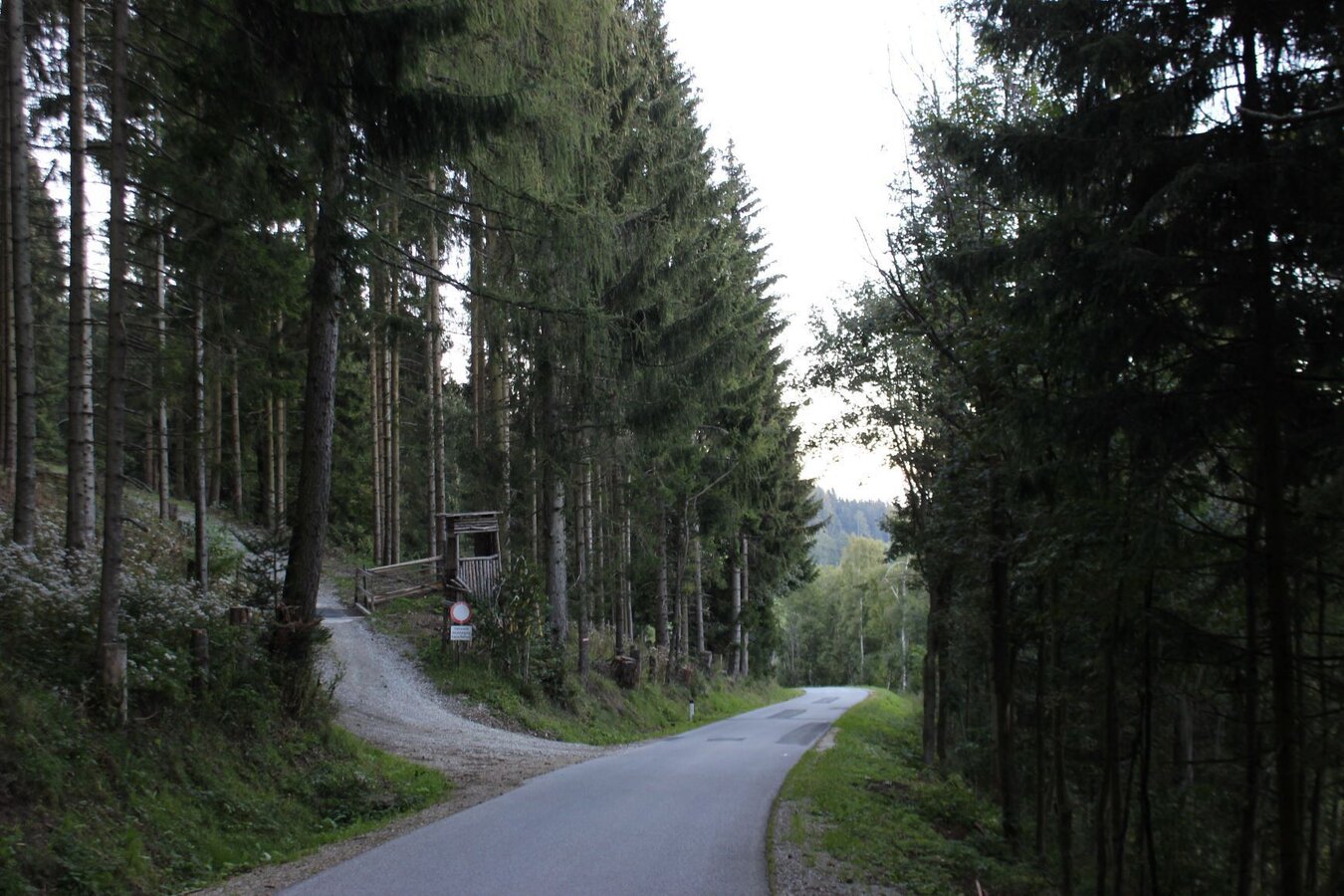 - Bei der nächsten Rechtskurve wechseln wir in den Karrenweg geradeaus (rot-weiß-rot markiert und Almenland-Hinweistafeln!).